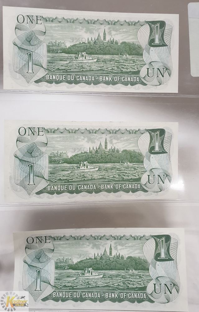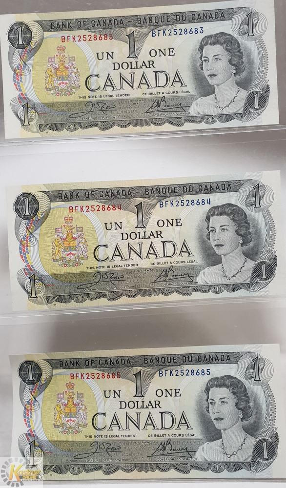 3 UNCIRCULATED SEQUENTIAL $1 BANKNOTES FROM 1973. BFK PREFIX WITH CROWN BOUEY SIGNATURES.