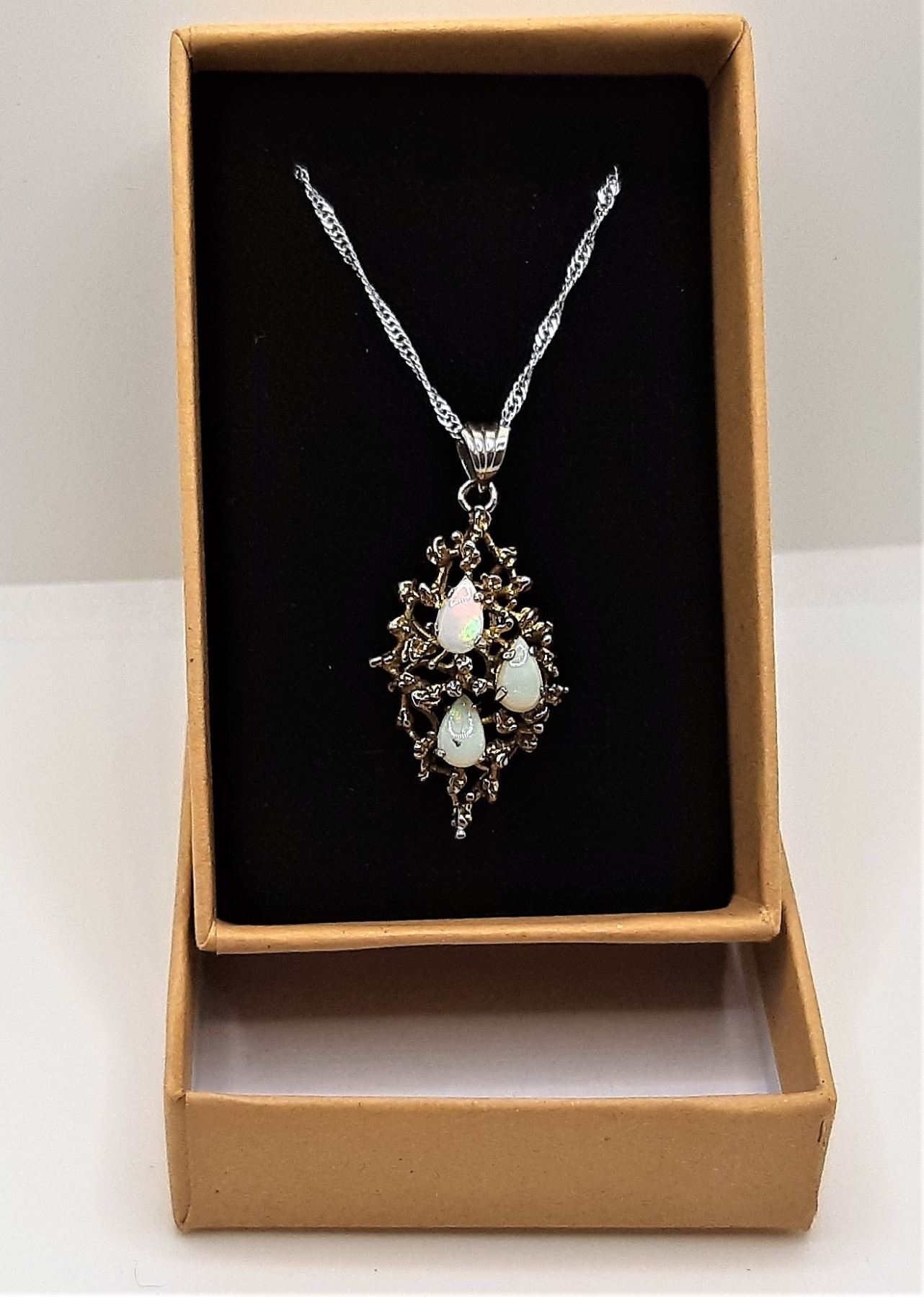 3 TEAR DROP SHAPED NATURAL WHITE FIRE OPALS, ON A 18" WAVE CHAIN, STAMPED 925. JEWELRY