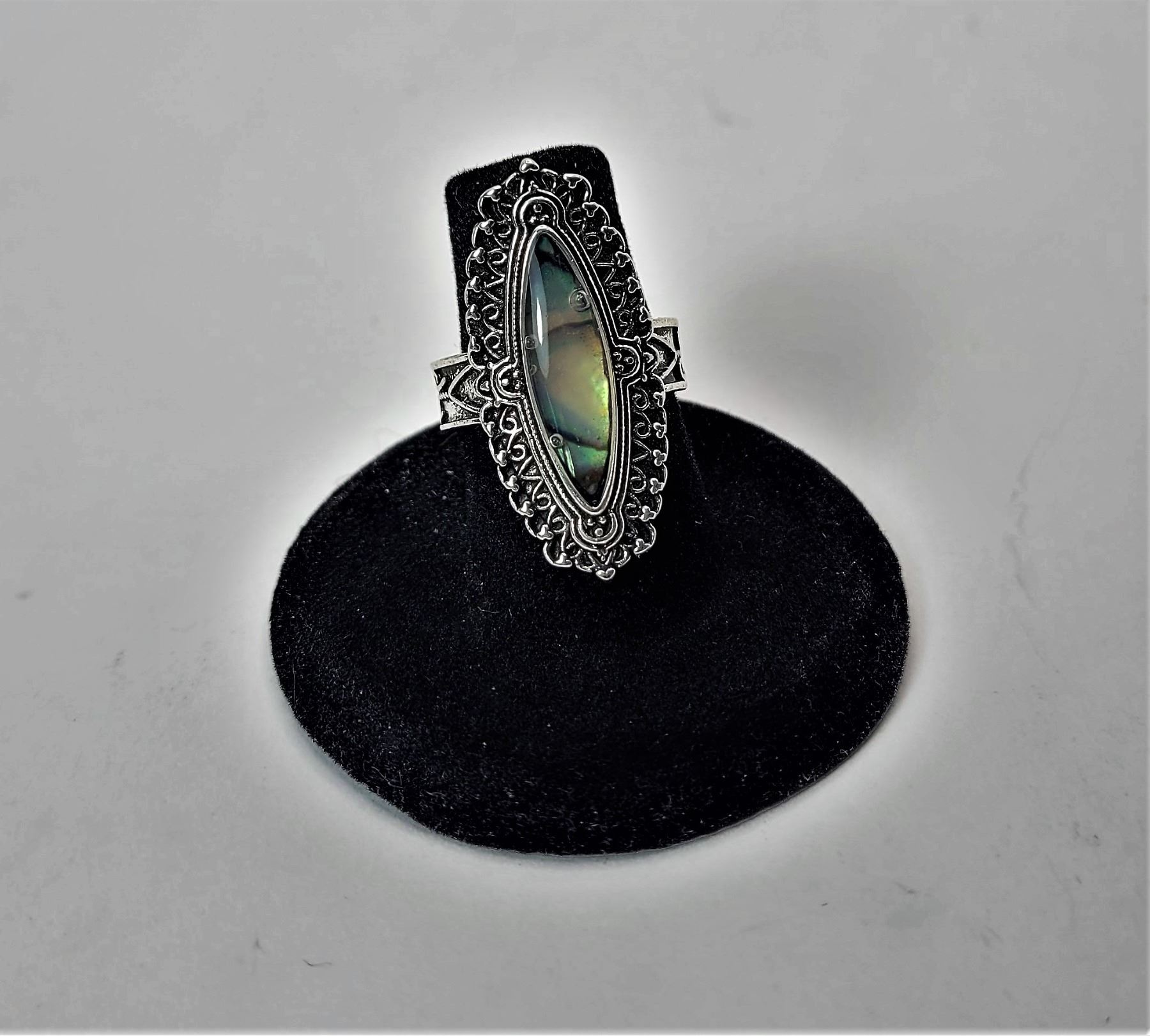 3) SILVER TONE NATURAL ABALONE STATEMENT RING WITH CARVED SETTING AND BAND, SIZE 8.