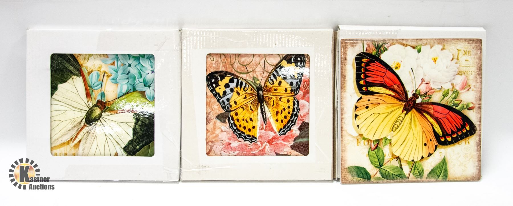 3 SQUARE CERAMIC TRIVETS,BUTTERFLY