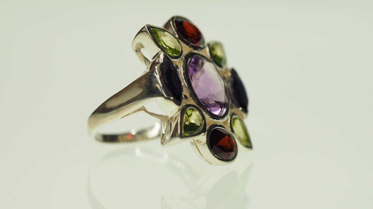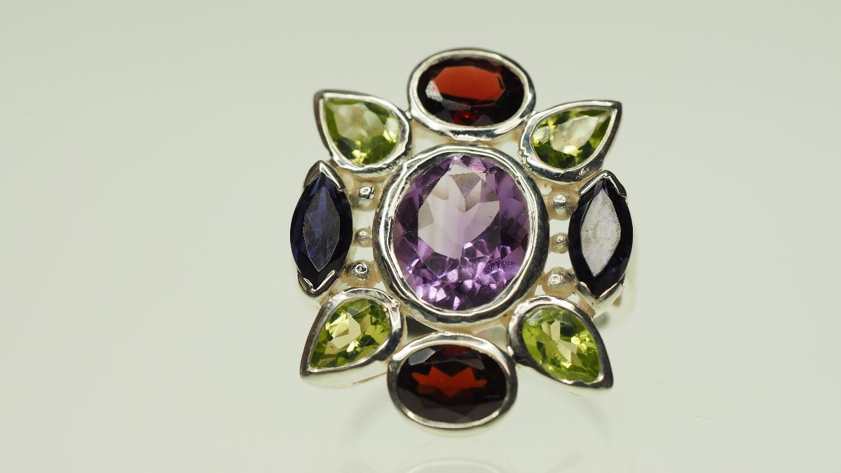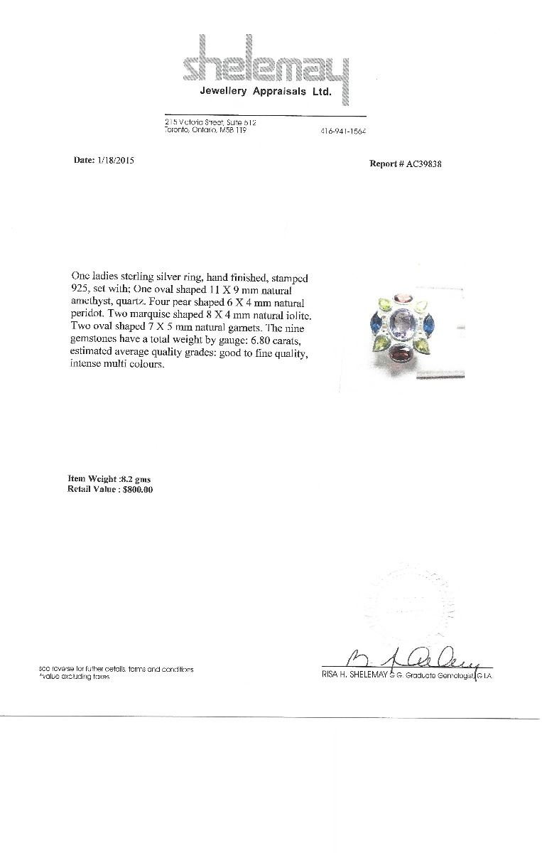 STERLING SILVER AMETHYST, PERIDOT, IOLITE, GARNET RING. W/ COA- SUGGESTED RETAIL VALUE $800.00