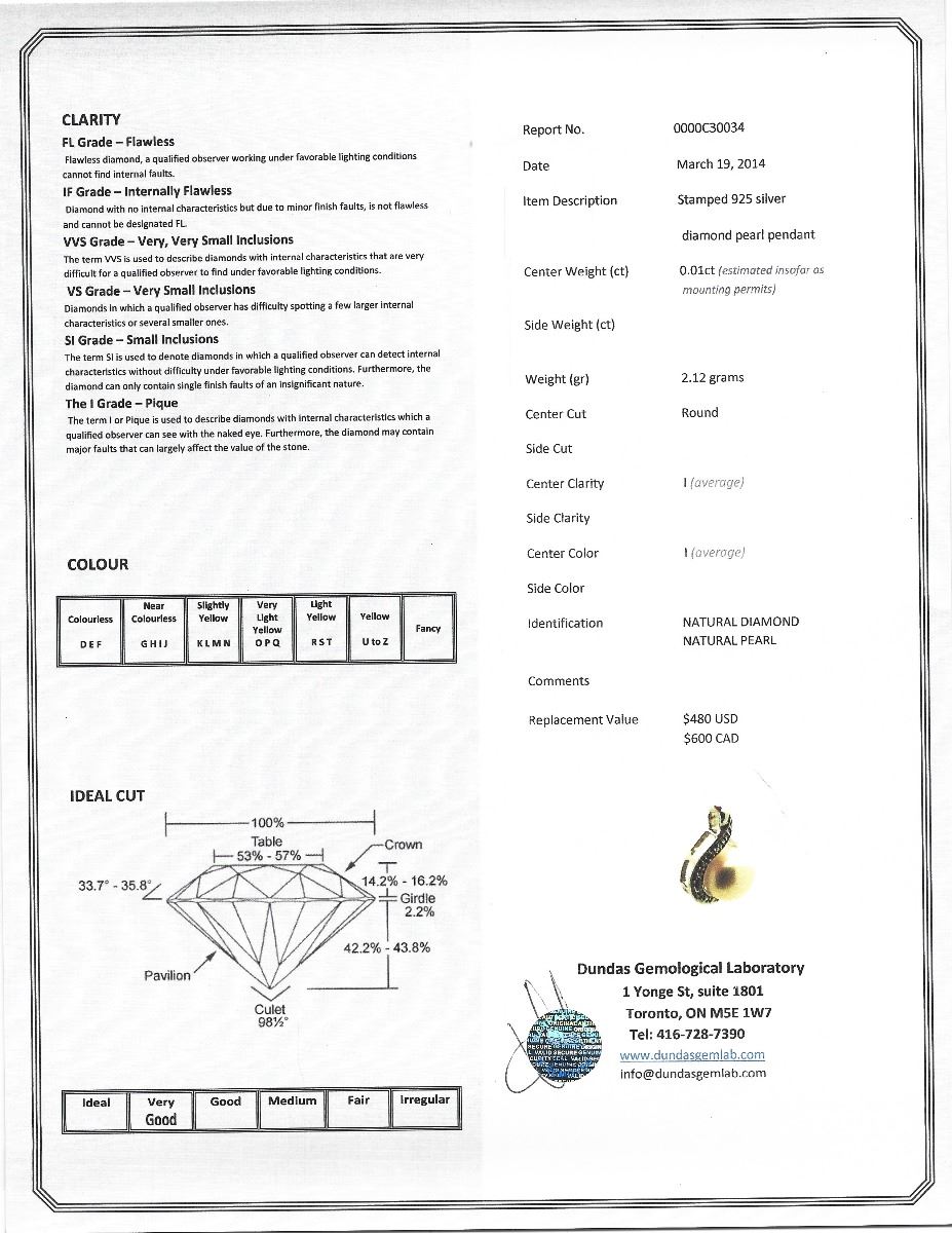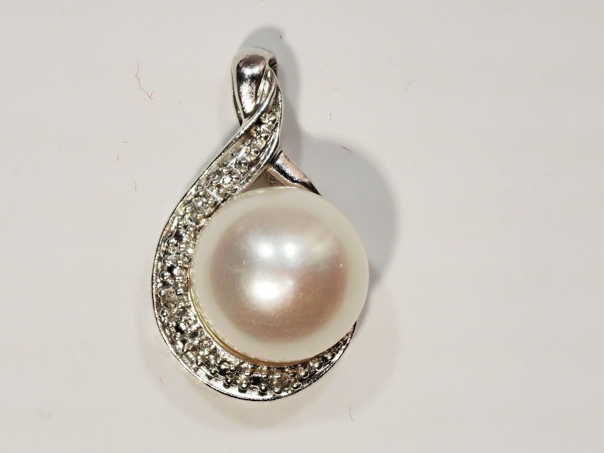 STERLING SILVER PEARL AND DIAMOND PENDANT. WITH COA- SUGGESTED REPLACEMENT VALUE $600.00