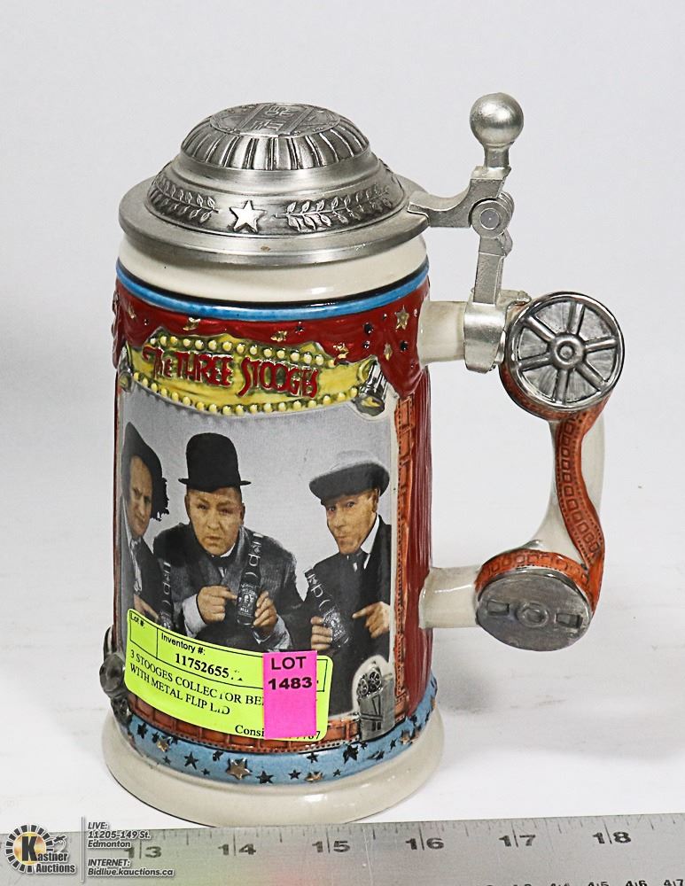 3 STOOGES COLLECTOR BEER STEIN WITH METAL FLIP LID