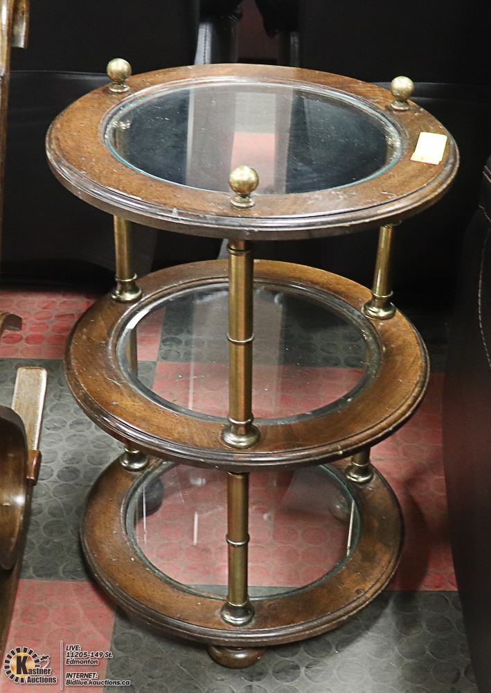 3 TIER ROUND SIDE/CURIO TABLE WOOD AND GLASS