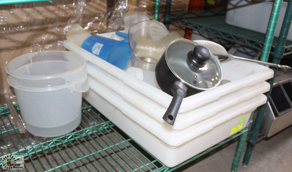, BOTTLES, MEASURING CUPS, POTS W/ GLASS LID.