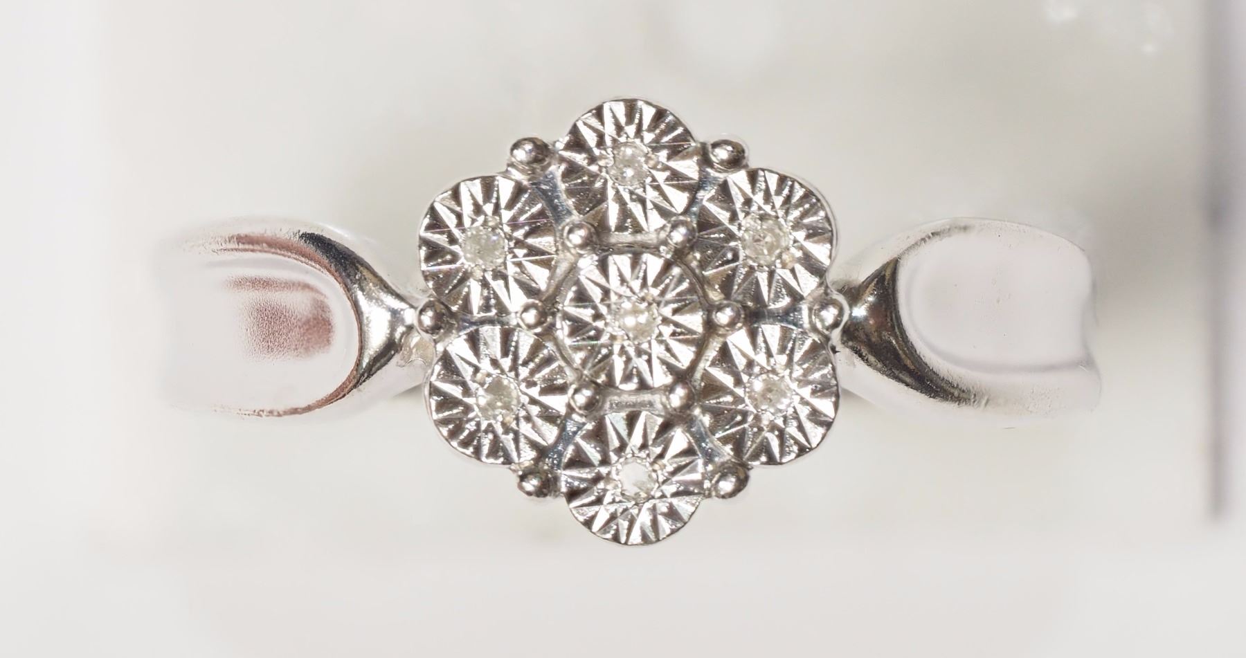 3-NT58- TWO STERLING SILVER 7 DIAMOND FLORAL RINGS, SIZES 6.5 & 7. JEWELLERY