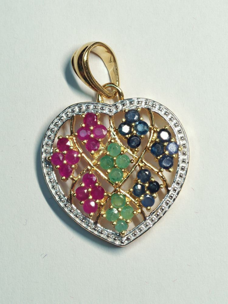 503 - CR62 - TWO-TONE STERLING SILVER EMERALD RUBY SAPPHIRE PENDANT (~WEIGHT 3.3G). JEWELRY