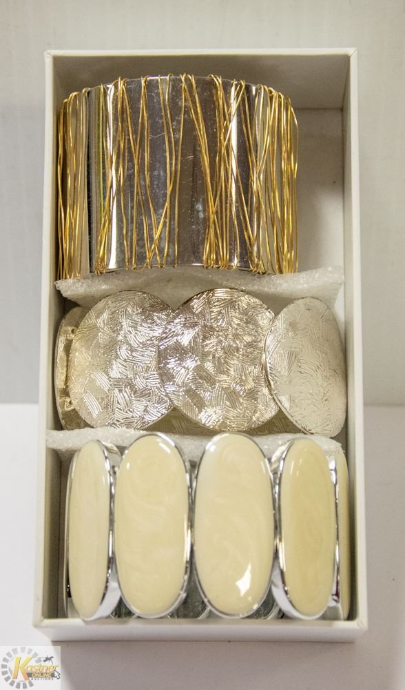 SILVER TONE OVERLAP DISCS, IVORY SHELL, CUFF WITH GOLD WIRE