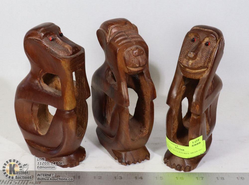 HEAR NO EVIL, SEE NO EVIL, SPEAK NO EVIL. WOODEN SCULPTURES 2" WIDE BY 7" TALL EACH