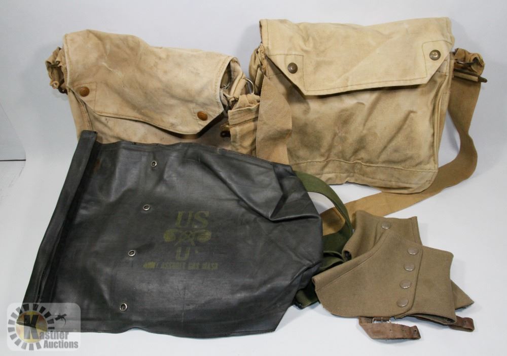 1-US ARMY D-DAY WATERPROOF BAG, 2 CANADIAN CANVAS – MAKE GREAT UTILITY TOOL BAGS. BAGS IS DIVIDED INSIDE, 1 PAIR CANADIAN SPATS