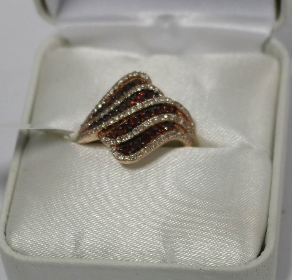 SIZE 6.75 A 14 KARAT ROSE GOLD FANCY COLOURED DIAMOND RING. THE BRIGHT CUT AND POLISHED RIBBON STYLE MOUNT IS BEAD SET WITH, 106 ROUND BRILLIANT CUT DIAMONDS MEASURING. 1.10 MM. CLARITY GRADE I-2. COLOUR GRADE H-H AND 29 GRADUATED SINGLE CUT FANCY COLOURED ORANGE/BROWN DIAMONDS MEASURING, 1.10- 1.80 MM. CLARITY GRADE SI-1 --1. TOTAL DIAMOND WEIGHT 1.14 CARAT. TOTAL WEIGHT 4.40 GRAMS. . .CERTIFICATE OF APPRAISAL FROM LOCAL