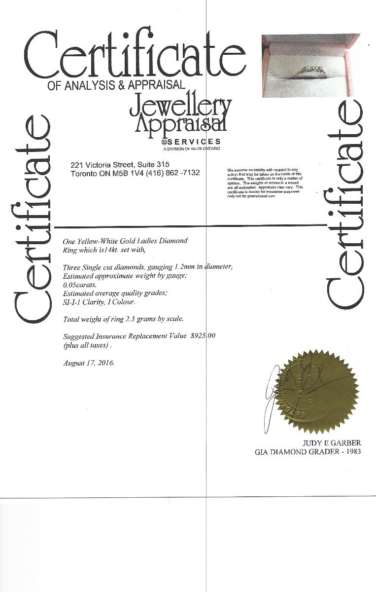 14K YELLOW GOLD DIAMOND RING. W/ COA- SUGGESTED REPLACEMENT VALUE $925