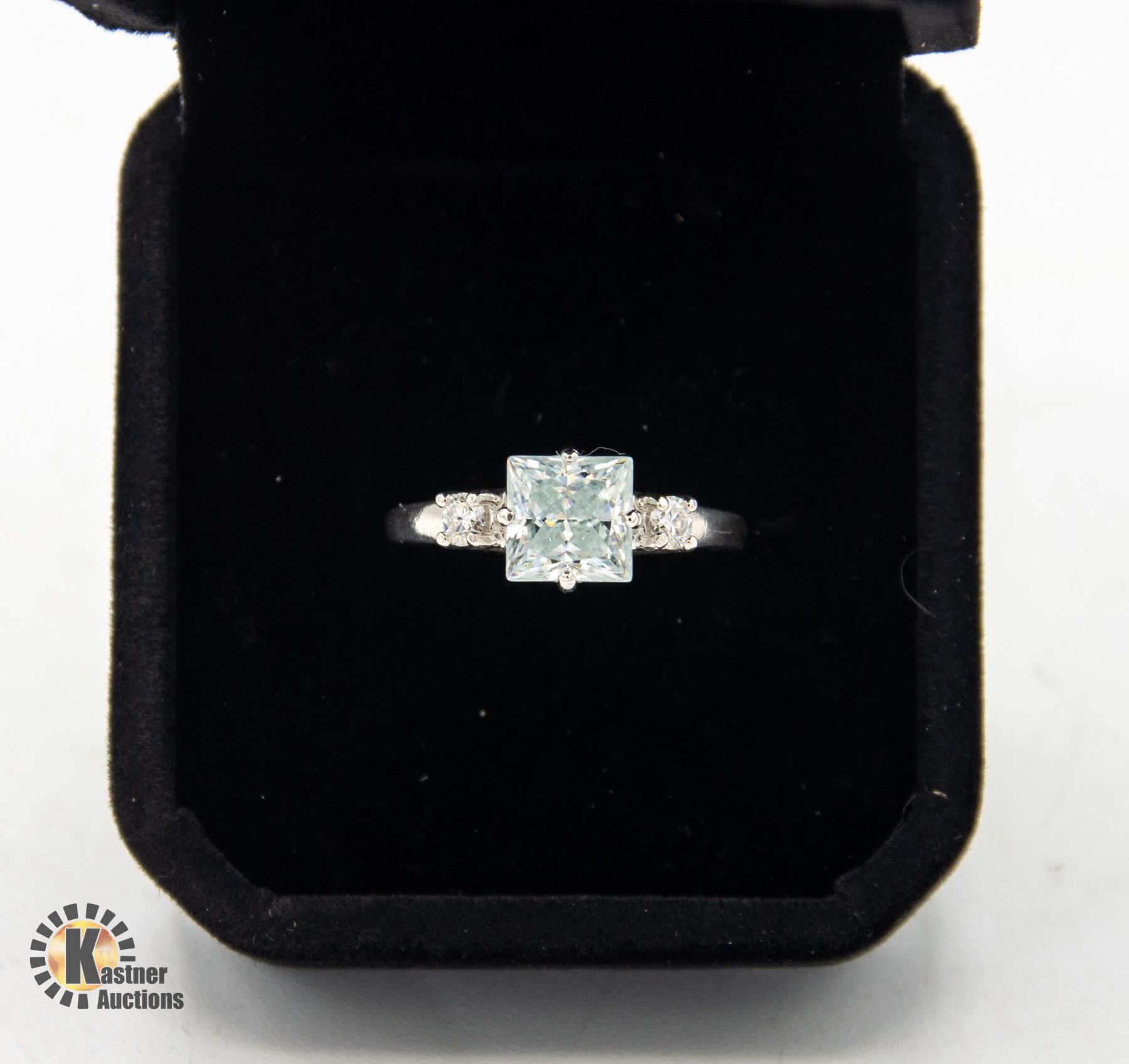 PRINCESS CUT WITH 0.11 CT SET ON EITHER SIDE FOR A TOTAL WEIGHT OF 2.22 CT SET IN STERLING SILVER RING SIZE 7.75 **ALL ITEMS MUST BE REMOVED BY 5PM SATURDAY, MARCH 30TH 2024. ALL REMAINING ITEMS WILL BE SUBJECT TO A $6.00 PER DAY STORAGE CHARGE. ANY ITEMS REMAINING AFTER MONDAY, APRIL 15TH, 2023 WILL BE CONSIDERED FORFEITED. NO REFUNDS WILL BE ISSUED FOR FORFEITED ITEMS. TO SCHEDULE A PICK UP APPOINTMENT CLICK HERE