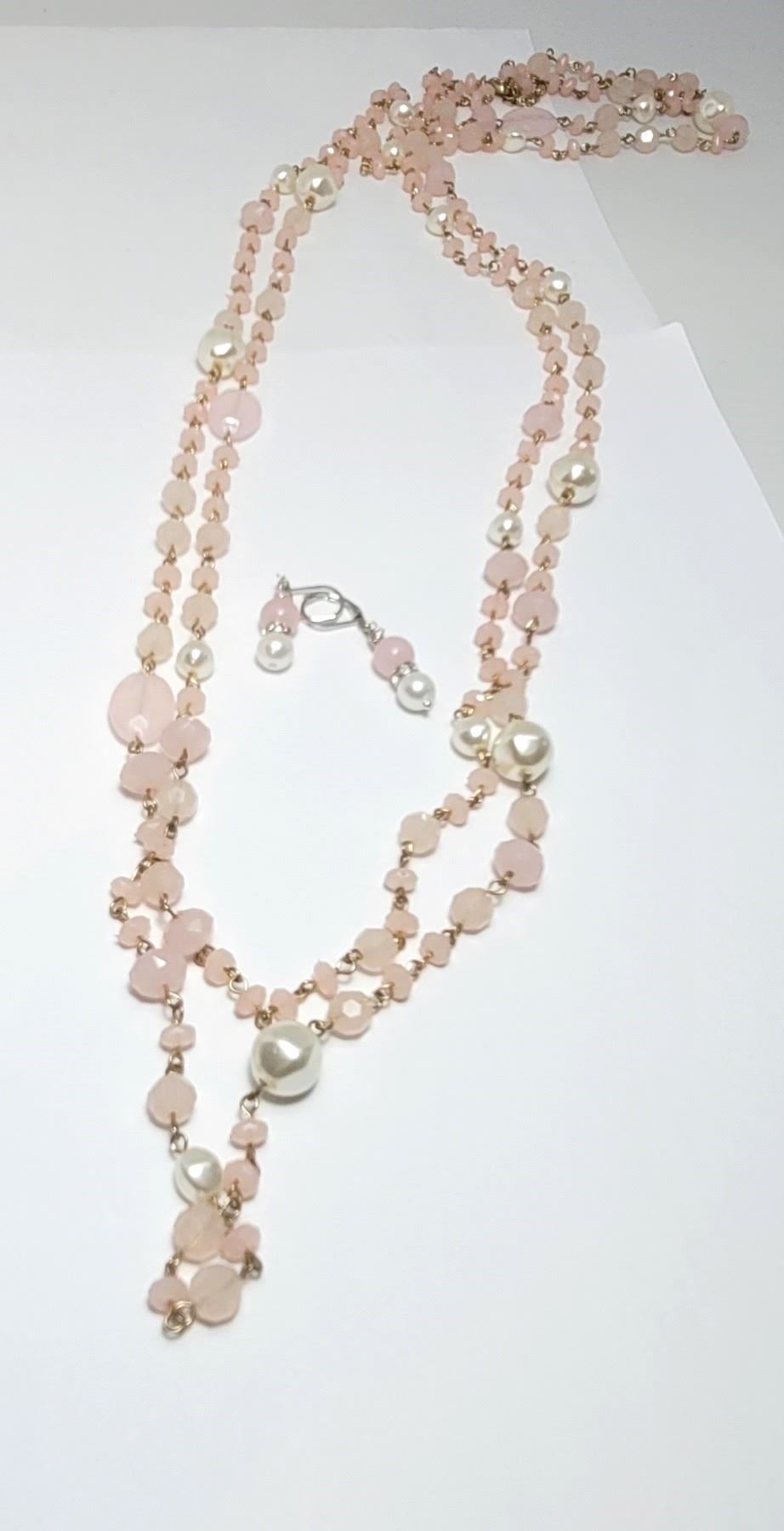 AND MATCHING PEARL AND ROSE QUARTZ DROP EARRINGS ON LEVERBACK WIRES. JEWELLERY