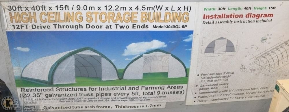 BUILDING COMES WITH COMMERCIAL FABRIC, WATERPROOF UV AND FIRE RESISTANT 12' X 12' DRIVE THROUGH DOORS AT TWO ENDS.