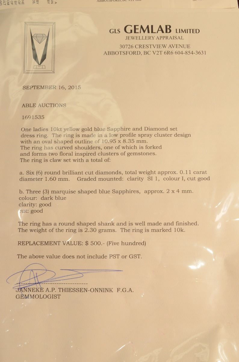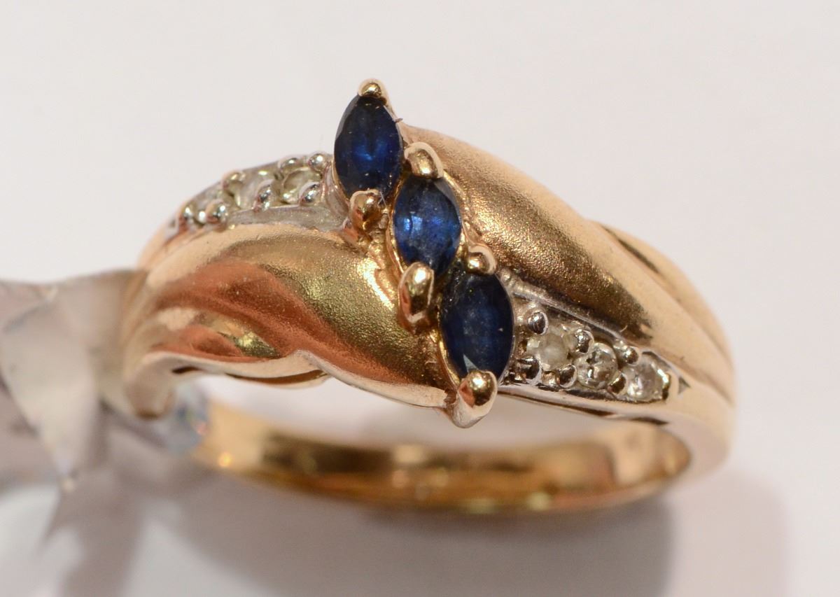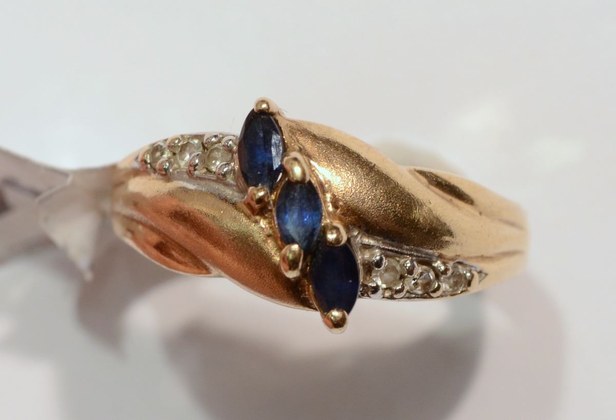 YELLOW GOLD RING WITH 3 SAPPHIRES IN A DIAGONAL LINE WITH 6 DIAMONDS (0.11CT), 3 ON EACH SIDE