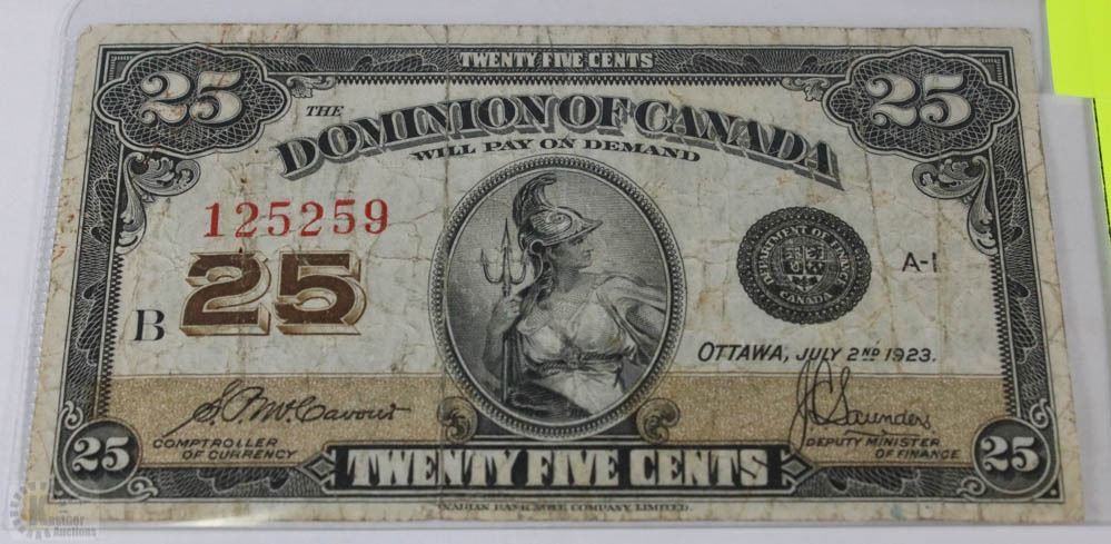 1923 DOMINION OF CANADA SHINPLASTER TWENTY FIVE CENTS IN SLEEVE 125259