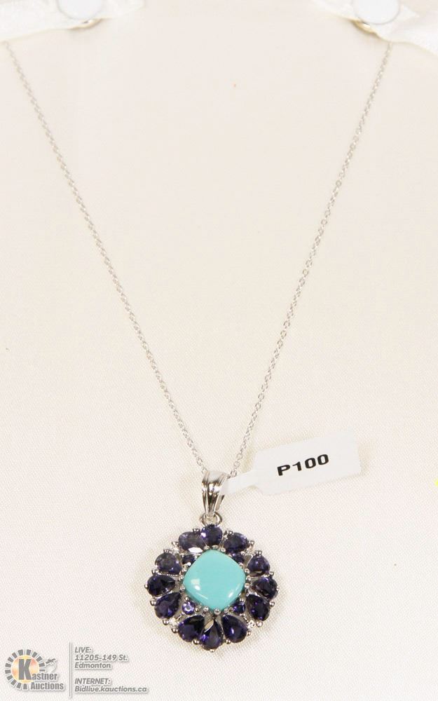 31-LS13- STERLING SILVER STABILIZED TURQUOISE & IOLITE PENDANT NECKLACE. JEWELRY.