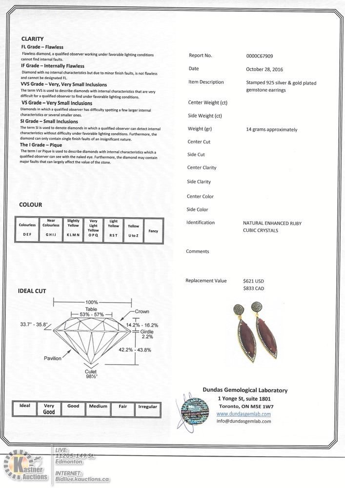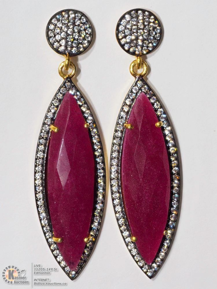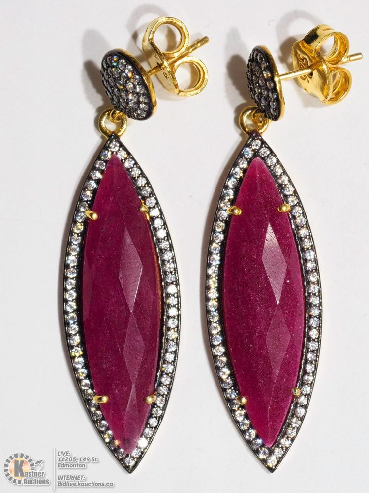 31-NT25- STERLING SILVER GOLD PLATED RUBY ANTIQUE STYLE DROP EARRINGS. W/COA. SUGGESTED REPLACEMENT VALUE $833.00