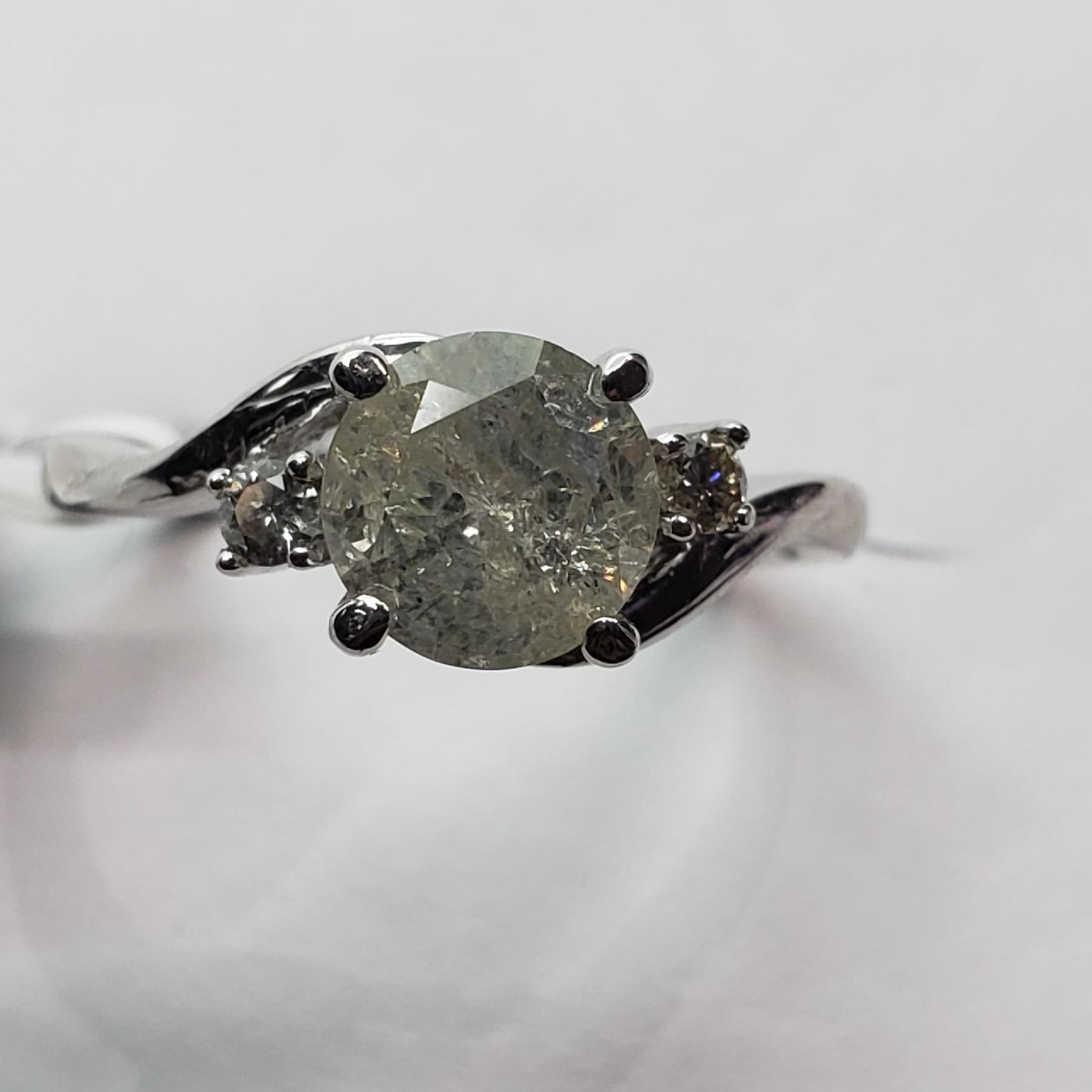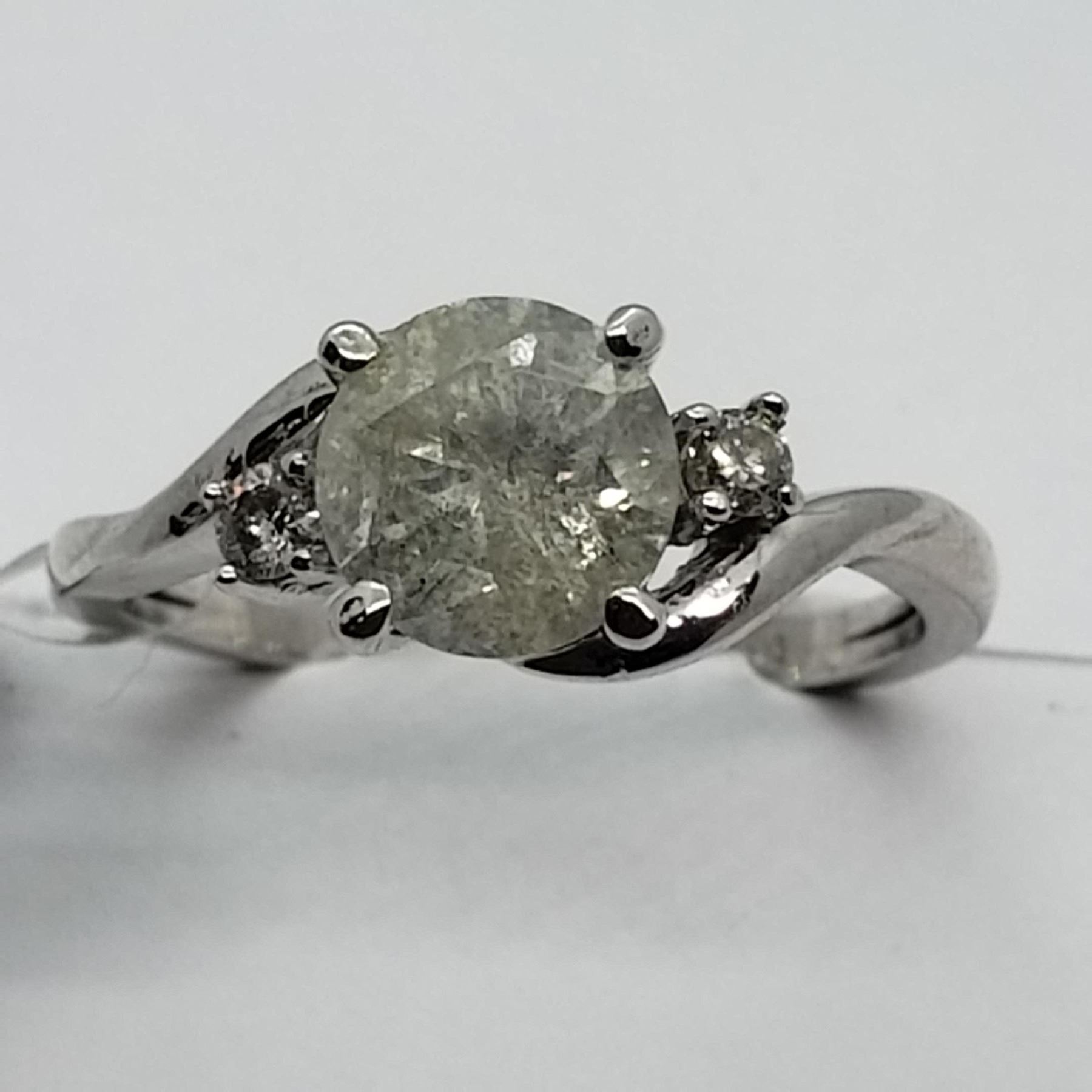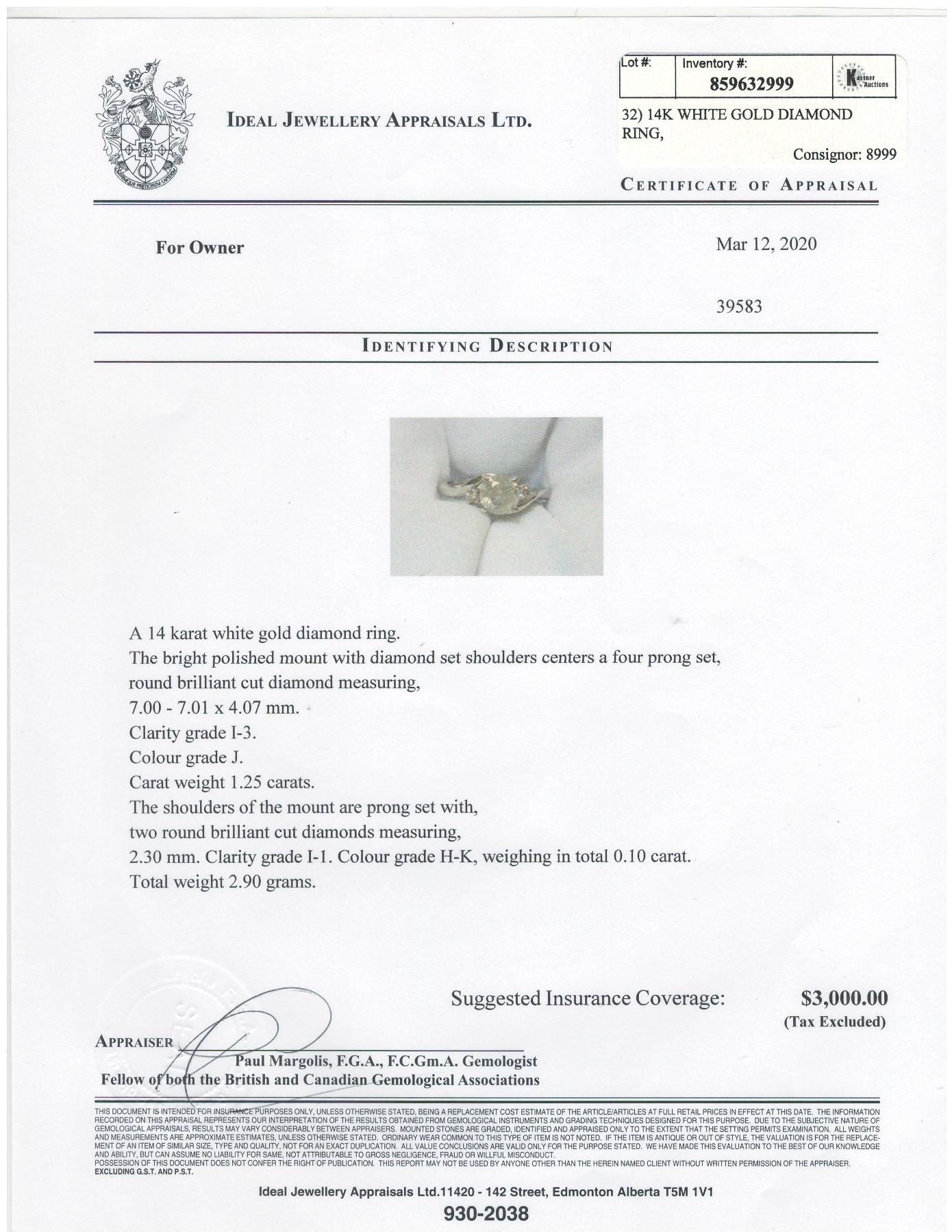 SIZE 7.25, ONE ROUND BRILLIANT CUT DIAMOND (MEASURING 7.00-7.01 X 4.07MM, CLARITY GRADE I-3, COLOR GRADE J, WEIGHING 1.25 CARATS), TWO ROUND BRILLIANT CUT DIAMONDS (MEASURING 2.30MM, CLARITY GRADE I-1, COLOR GRADE H-K, WEIGHING 0.10 CARATS). COMES WITH CERTIFICATE OF APPRAISAL FROM LOCAL APPRAISER. SUGGESTED INSURANCE COVERAGE $3,000.00. JEWELLERY