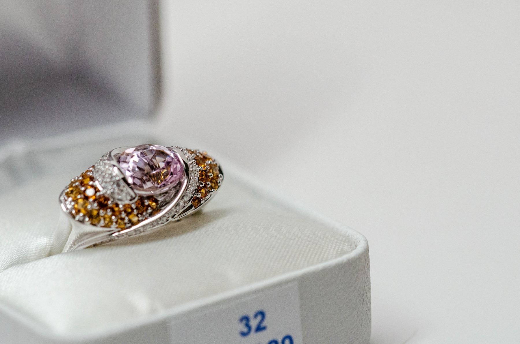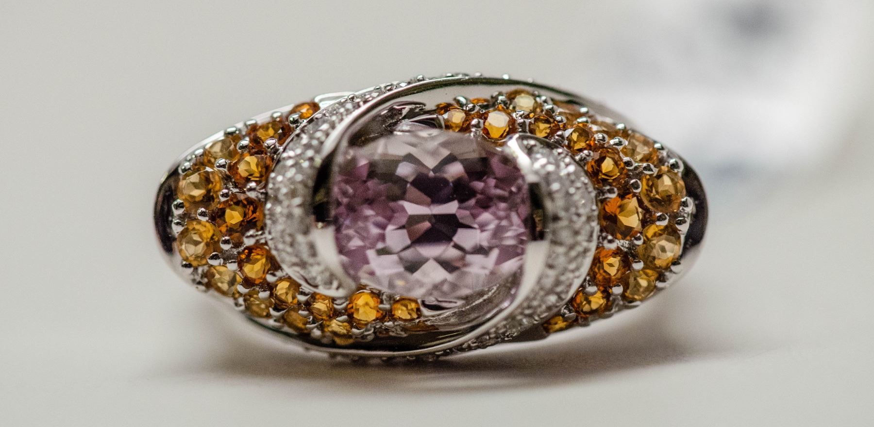 DIAMOND RING, SIZE 7. THE SWIRL DESIGN MOUNT CENTERS A HORIZONTALLY PRONG SET, OVAL SHAPED NATURAL AMETHYST (MEASURING 9.00 - 7.10 X 5.77 MM, TONE LIGHT, HUE PINKISH/PURPLE. THE AMETHYST WEIGHS 2.00 CARATS)SURROUNDING THE AMETHYST ARE 32 ROUND CUT NATURAL CITRINES (MEASURING 1.60 - 2.00 MM, WEIGHING IN TOTAL 0.60 CARAT) ALTERNATING WITH 48 ROUND BRILLIANT CUT DIAMONDS (MEASURING 1.00 - 1.30 MM, CLARITY GRADE I-1, COLOUR GRADE G-H, WEIGHING INTOTAL 0.30 CARAT) COMES WITH CERTIFICATE OF APPRAISAL FROM LOCAL APPRAISER, SUGGESTED INSURANCE COVERAGE $2280.00. JEWELLERY