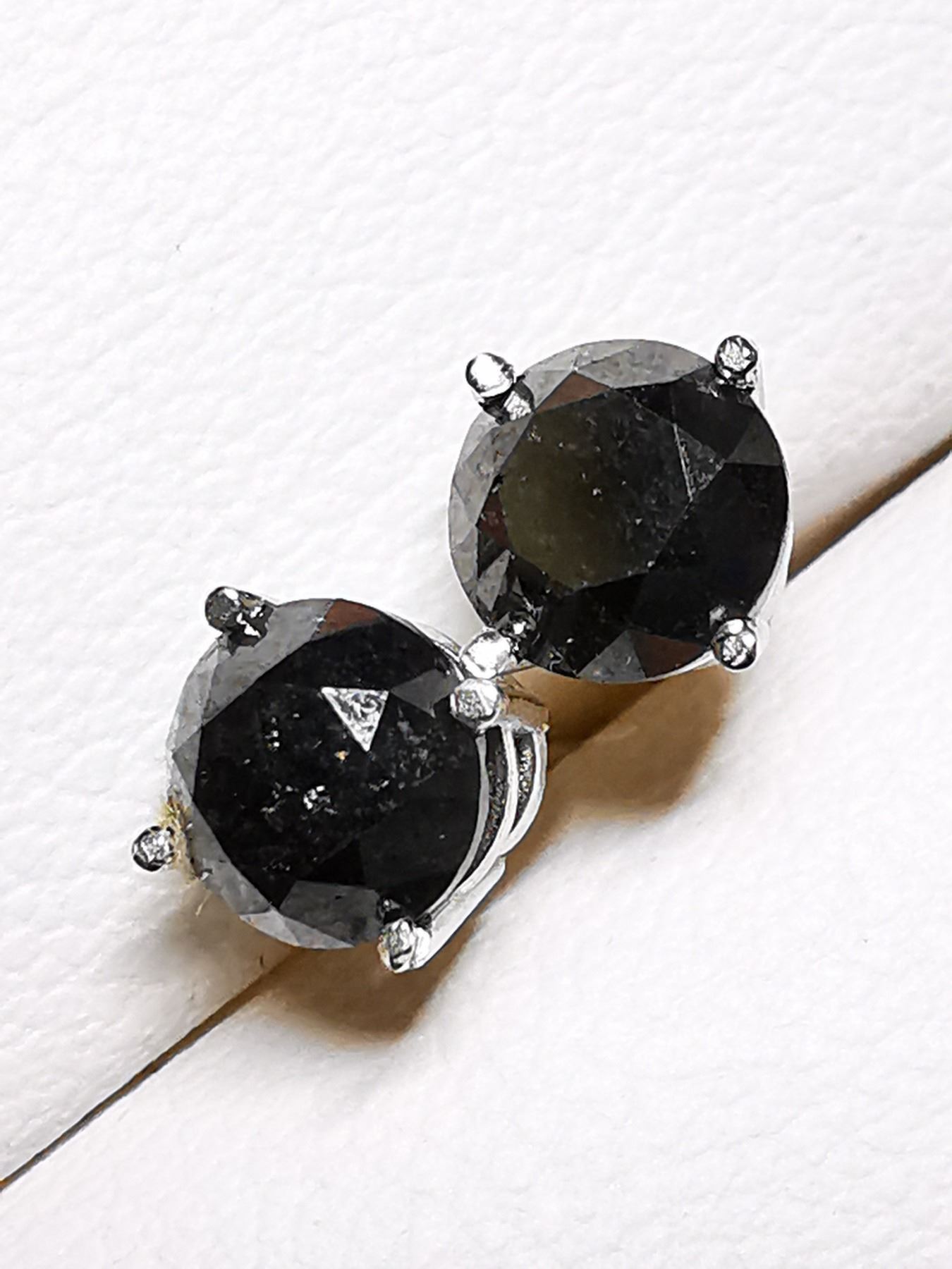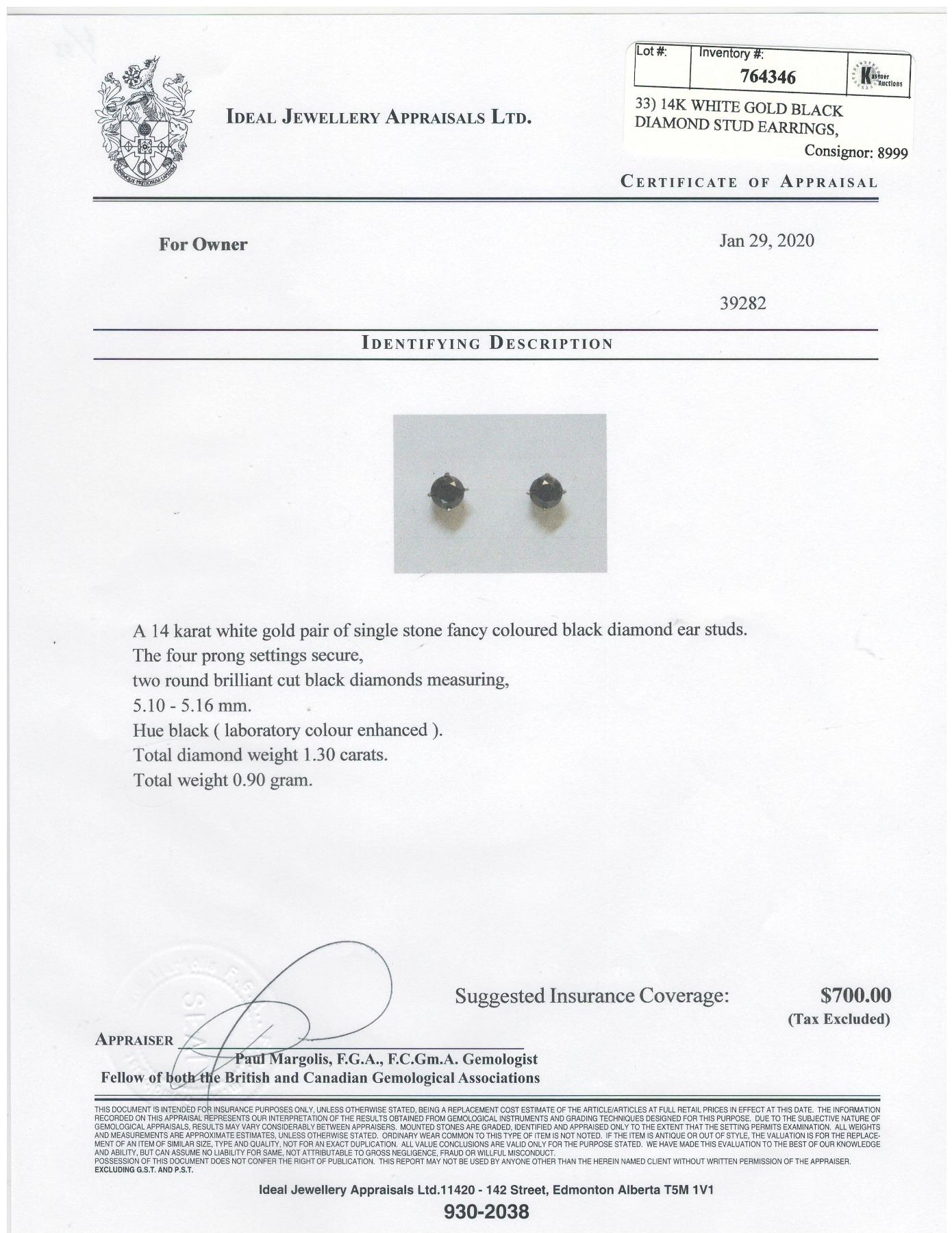 TWO ROUND BRILLIANT CUT BLACK DIAMONDS (MEASURING 5.10 - 5.16 MM, HUE BLACK [LAB COLOR ENHANCED] WEIGHING 1.30 CARATS). COMES WITH CERTIFICATE OF APPRAISAL FROM LOCAL APPRAISER, SUGGESTED INSURANCE COVERAGE $700.00. JEWELLERY