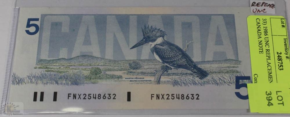 1986 BIRD SERIES UNCIRCULATED REPLACEMENT NOTE $5 THIESSEN CROW FNX2548632 BANK OF CANADA