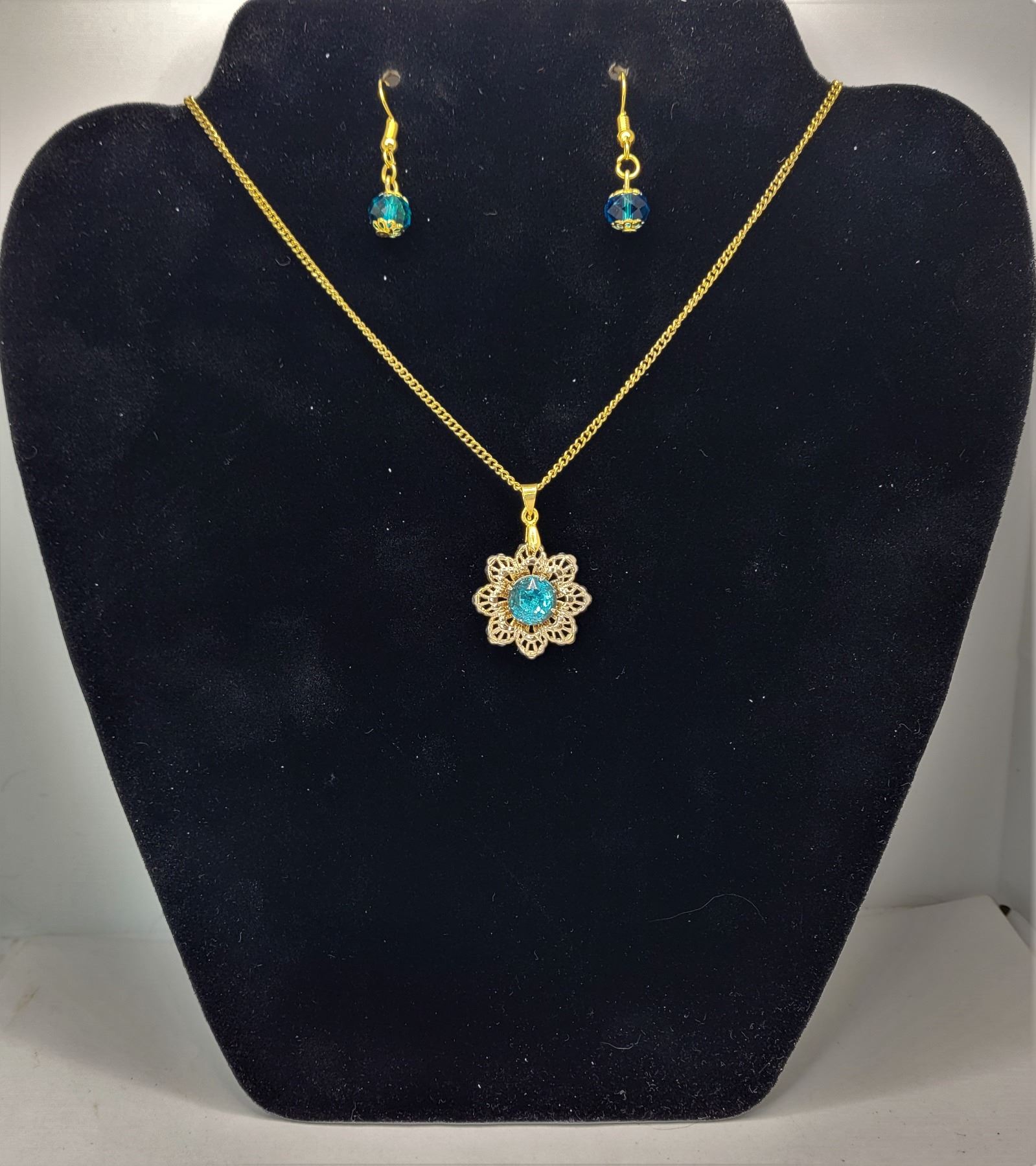 33) GOLD TONE WITH TURQUOISE RHINESTONE OPEN FILAGREE FLOWER PENDANT ON 18" CHAIN AND COORDINATING