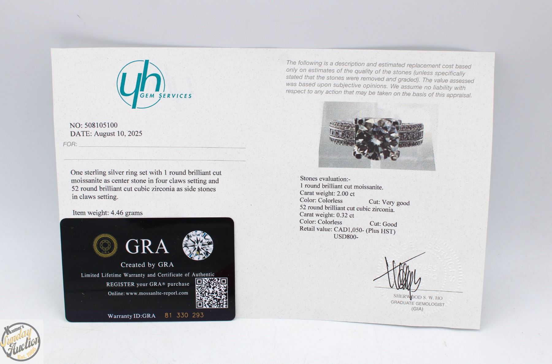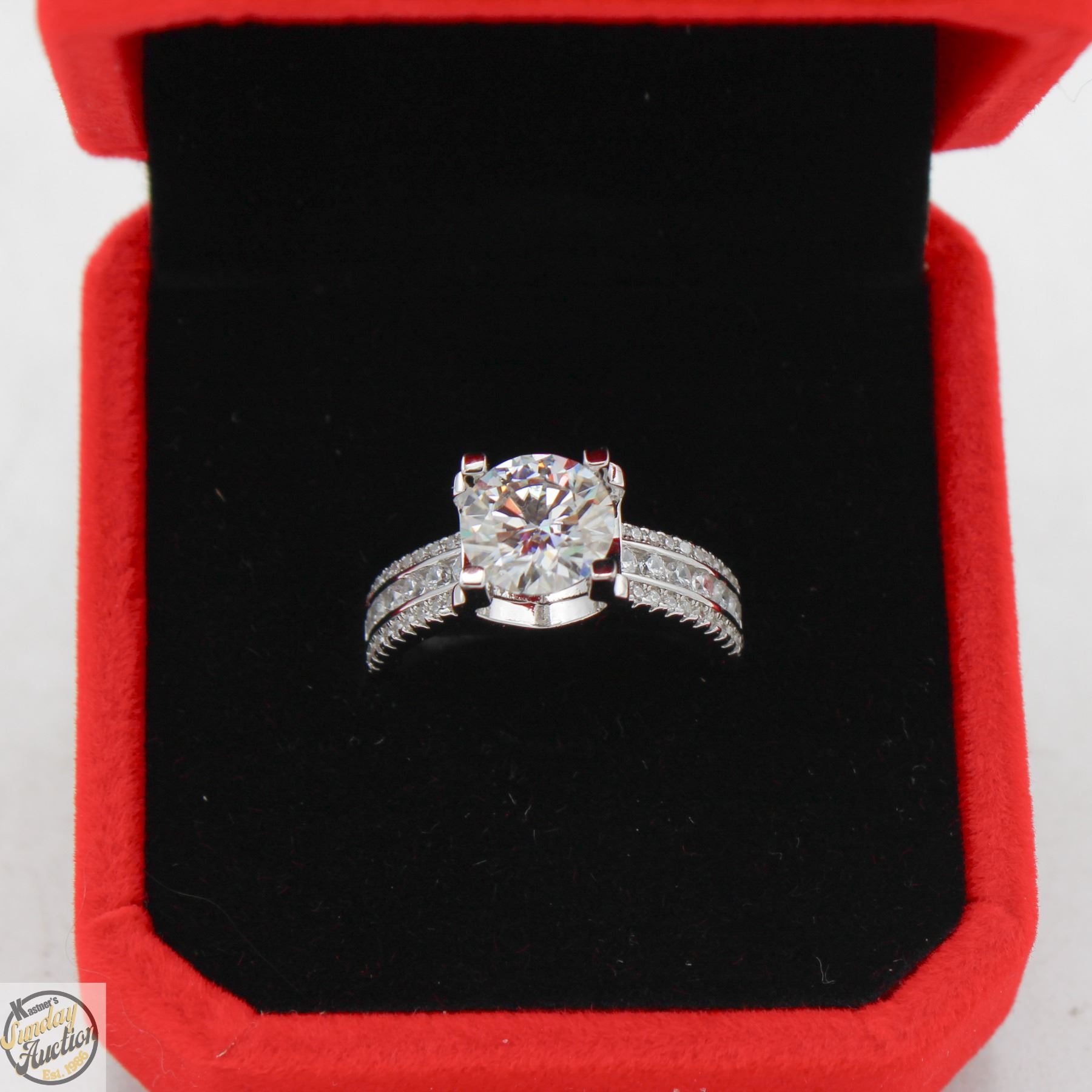 MOISSANITE STONES VVS D COLOR WITH 52 ROUND BRILLIANT CUT CUBIC ZIRCONIA WITH LARGER SIZE SET IN CENTER ROW WITH SMALLER SIZE SET ON EITHER SIDE SET IN 925 SILVER RING SIZE 6.5 RETAIL VALUE $1,050.00 **ALL ITEMS MUST BE REMOVED BY 5PM SATURDAY, DECEMBER 6TH 2025. ALL REMAINING ITEMS WILL BE SUBJECT TO A $6.00 PER DAY STORAGE CHARGE. ANY ITEMS REMAINING AFTER MONDAY, DECEMBER 22ND 2025 WILL BE CONSIDERED FORFEITED. NO REFUNDS WILL BE ISSUED FOR FORFEITED ITEMS. TO SCHEDULE A PICK UP APPOINTMENT CLICK HERE