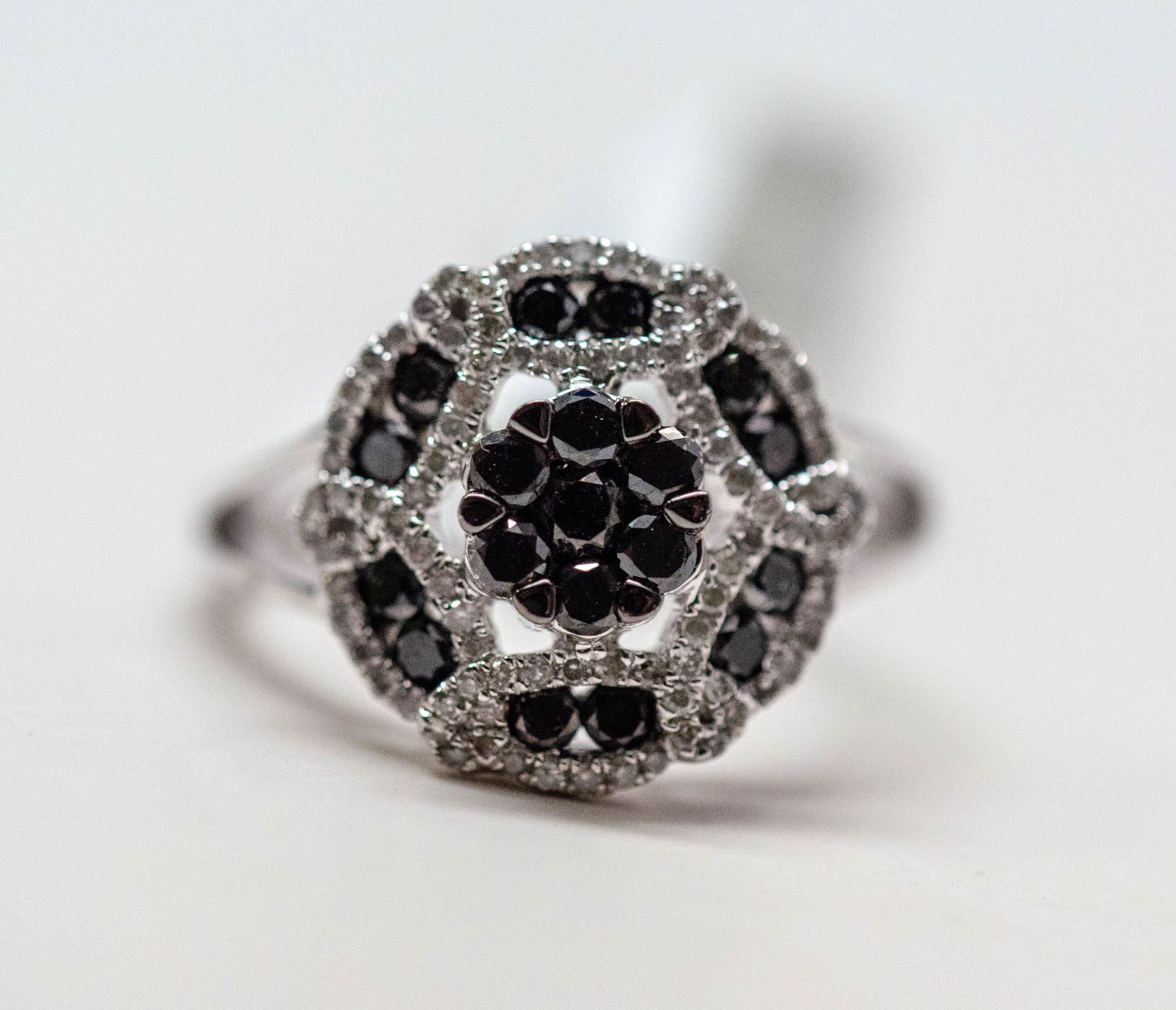 THE DOUBLE HALO ILLUSION STYLE MOUNT IS BEAD SET WITH 19 ROUND BRILLIANT CUT FANCY COLOURED BLACK DIAMONDS, LABORATORY COLOUR ENHANCED, (MEASURING, 2.20 - 3.00 MM, THE BLACK DIAMONDS WEIGH IN TOTAL0.90 CARAT) SURROUNDING ARE 90 ROUND BRILLIANT CUT DIAMONDS (MEASURING 0.80 - 0.90 MM, WEIGHING IN TOTAL 0.25 CARAT) COMES WITH CERTIFICATE OF APPRAISAL FROM LOCAL APPRAISER, SUGGESTED INSURANCE COVERAGE $1600.00.JEWELLERY