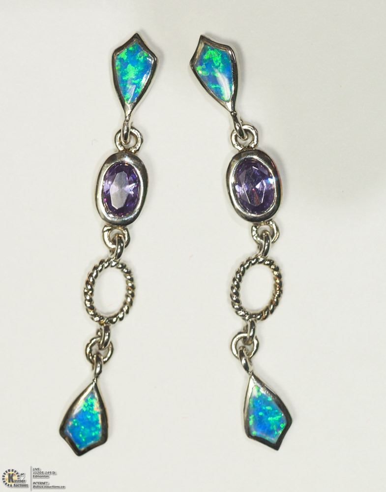 34 - BA25 - STERLING SILVER CREATED OPAL AND TANZANITE EARRINGS