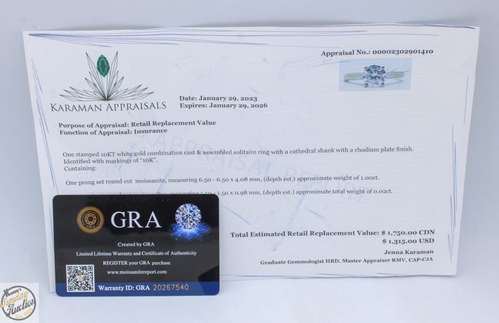 CERTIFIED ROUND BRILLIANT CUT MOISSANITE STONE VVS D COLOR WITH 2 ROUND BRILLIANT CUT MOISSANITE SET IN SHANKS RING SIZE 5.5 RETAIL VALUE $1,750.00 **ALL ITEMS MUST BE REMOVED BY 5PM SATURDAY, DECEMBER 13TH 2025. ALL REMAINING ITEMS WILL BE SUBJECT TO A $6.00 PER DAY STORAGE CHARGE. ANY ITEMS REMAINING AFTER MONDAY, DECEMBER 29TH 2025 WILL BE CONSIDERED FORFEITED. NO REFUNDS WILL BE ISSUED FOR FORFEITED ITEMS. TO SCHEDULE A PICK UP APPOINTMENT CLICK HERE