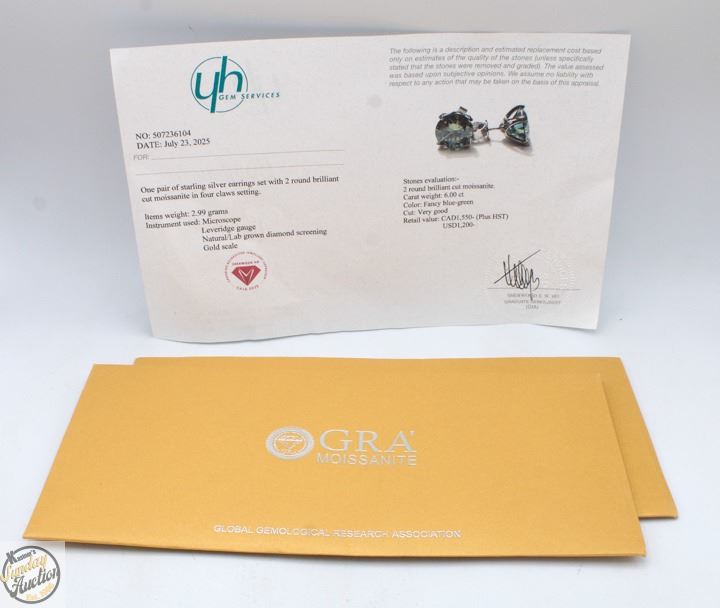 CUT MOISSANITE STONES VVS CYAN/FANCY BLUE-GREEN COLOR SET IN 4 CLAW BASKET HEAD SET IN 925 SILVER EARRINGS RETAIL VALUE $1,550.00 **ALL ITEMS MUST BE REMOVED BY 5PM SATURDAY, DECEMBER 13TH 2025. ALL REMAINING ITEMS WILL BE SUBJECT TO A $6.00 PER DAY STORAGE CHARGE. ANY ITEMS REMAINING AFTER MONDAY, DECEMBER 29TH 2025 WILL BE CONSIDERED FORFEITED. NO REFUNDS WILL BE ISSUED FOR FORFEITED ITEMS. TO SCHEDULE A PICK UP APPOINTMENT CLICK HERE