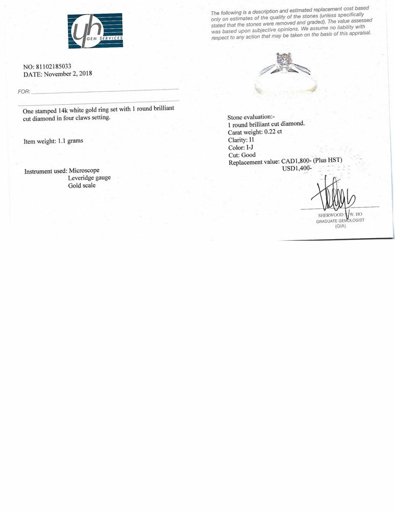 135 - JT52 - 14K WHITE GOLD DIAMOND (0.22CTS) RING (SIZE 5.75) (~WEIGHT 1.1G), MADE IN CANADA W/COA. SUGGESTED REPLACEMENT VALUE $1800.00. APPRAISAL NOT FROM A LOCAL VERIFIED APPRAISER. JEWELRY