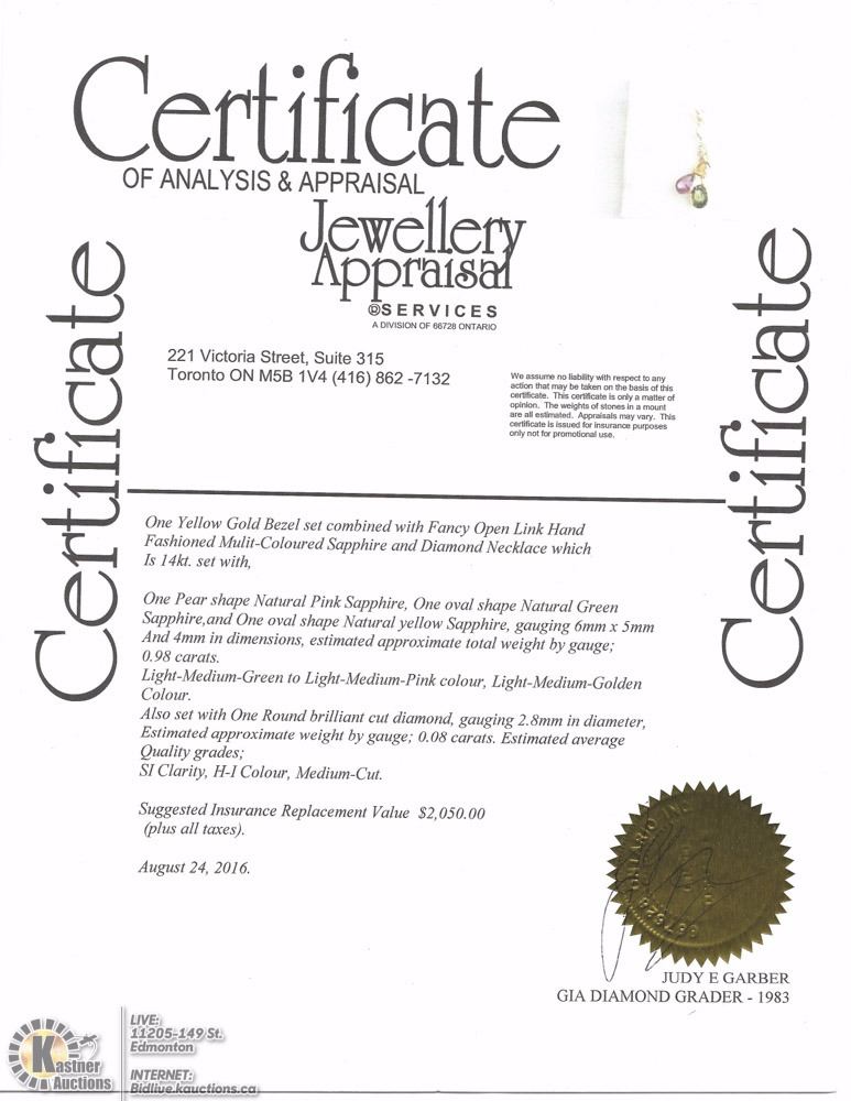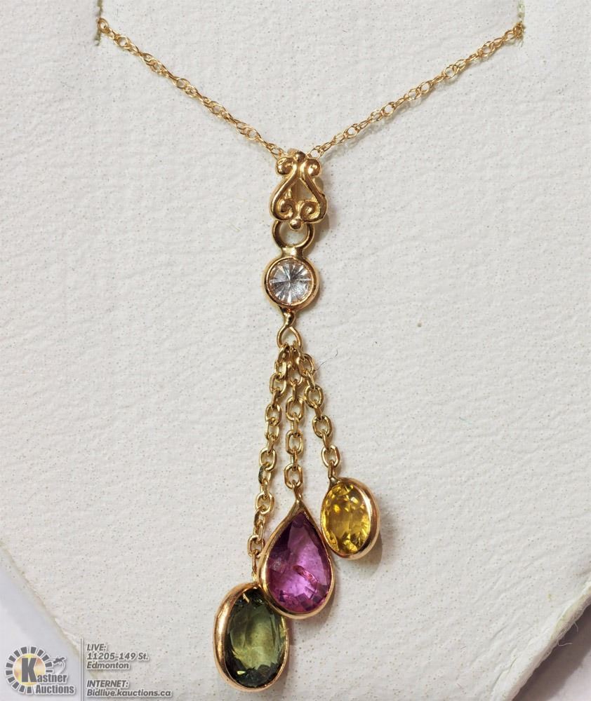 35 - GS15: 14KT YELLOW GOLD FANCY COLOR SAPPHIRES AND DIAMOND (TOTAL 0.98CT) PENDANT WITH CHAIN W/ COA - SUGGESTED REPLACEMENT VALUE $2050.00