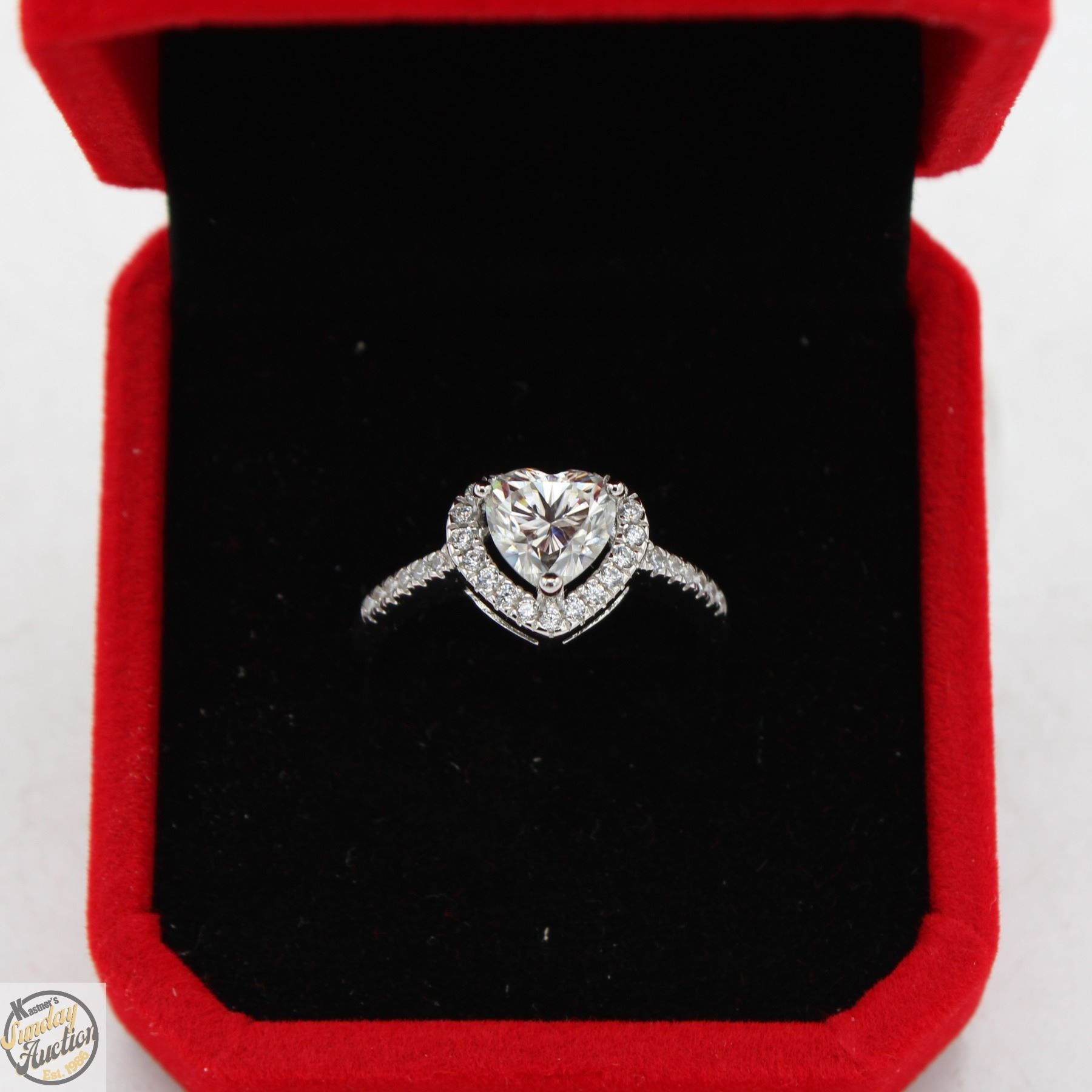 CUT MOISSANITE STONE VVS D COLOR WITH 32 ROUND BRILLIANT CUT CUBIC ZIRCONIA SET IN HEART HALO WITH MORE SET IN SHANKS SET IN 925 SILVER RING SIZE ADJUSTABLE **ALL ITEMS MUST BE REMOVED BY 5PM SATURDAY, DECEMBER 13TH 2025. ALL REMAINING ITEMS WILL BE SUBJECT TO A $6.00 PER DAY STORAGE CHARGE. ANY ITEMS REMAINING AFTER MONDAY, DECEMBER 29TH 2025 WILL BE CONSIDERED FORFEITED. NO REFUNDS WILL BE ISSUED FOR FORFEITED ITEMS. TO SCHEDULE A PICK UP APPOINTMENT CLICK HERE