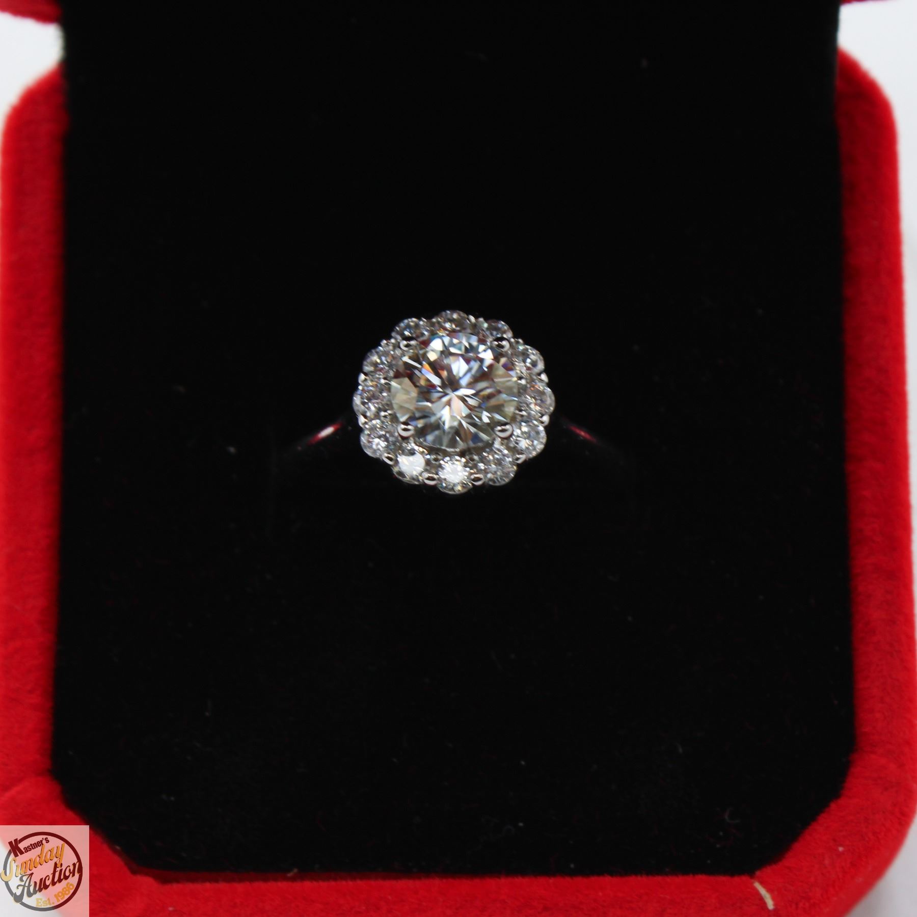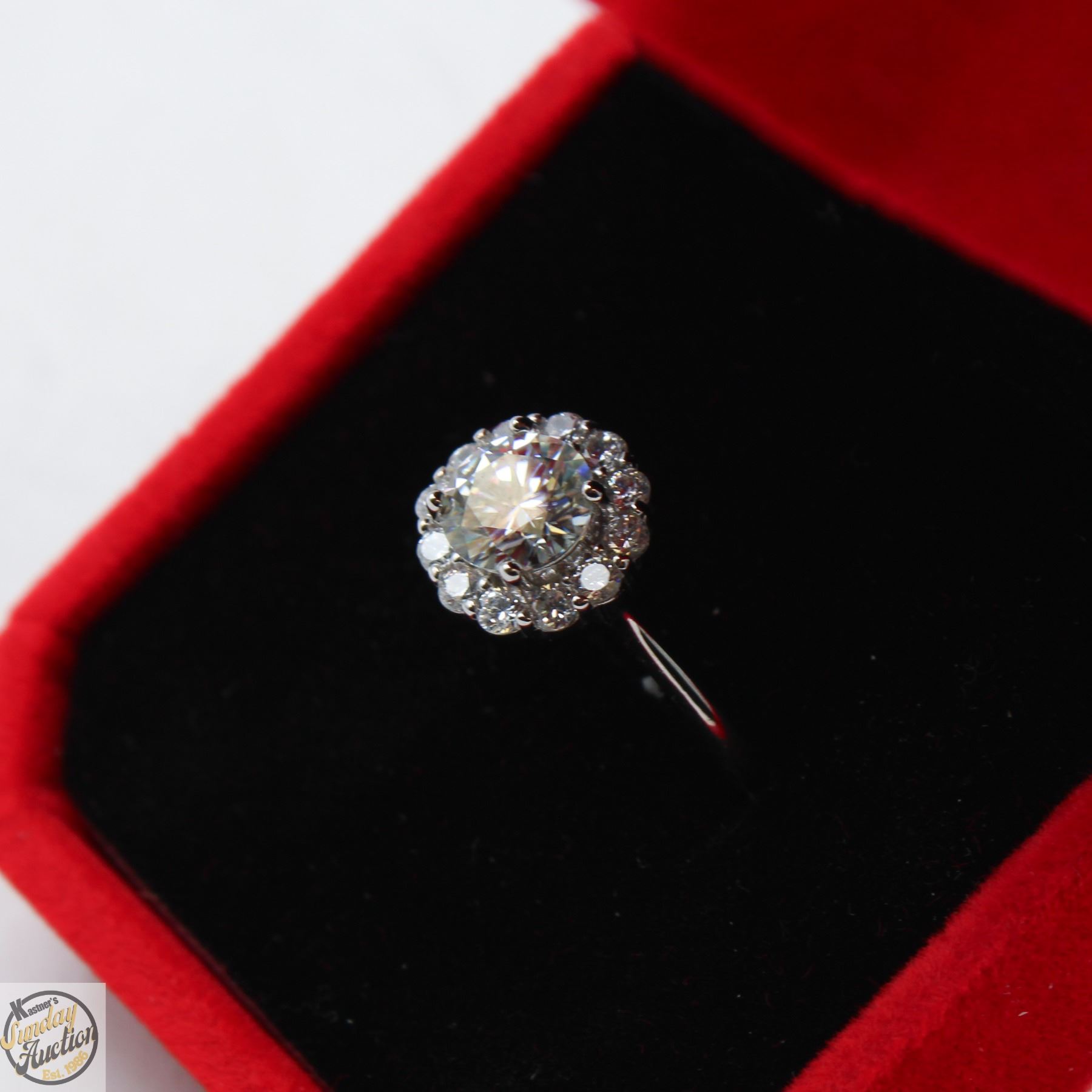 BRILLIANT CUT MOISSANITE STONE VVS D COLOR WITH 12 ROUND BRILLIANT CUT CUBIC ZIRCONIA STONES SET IN ROUND HALO AND SET IN 925 SILVER RING SIZE ADJUSTABLE **ALL ITEMS MUST BE REMOVED BY 5PM SATURDAY, JANUARY 17TH 2026. ALL REMAINING ITEMS WILL BE SUBJECT TO A $6.00 PER DAY STORAGE CHARGE. ANY ITEMS REMAINING AFTER MONDAY, FEBRUARY 2ND 2026 WILL BE CONSIDERED FORFEITED. NO REFUNDS WILL BE ISSUED FOR FORFEITED ITEMS. TO SCHEDULE A PICK UP APPOINTMENT CLICK HERE