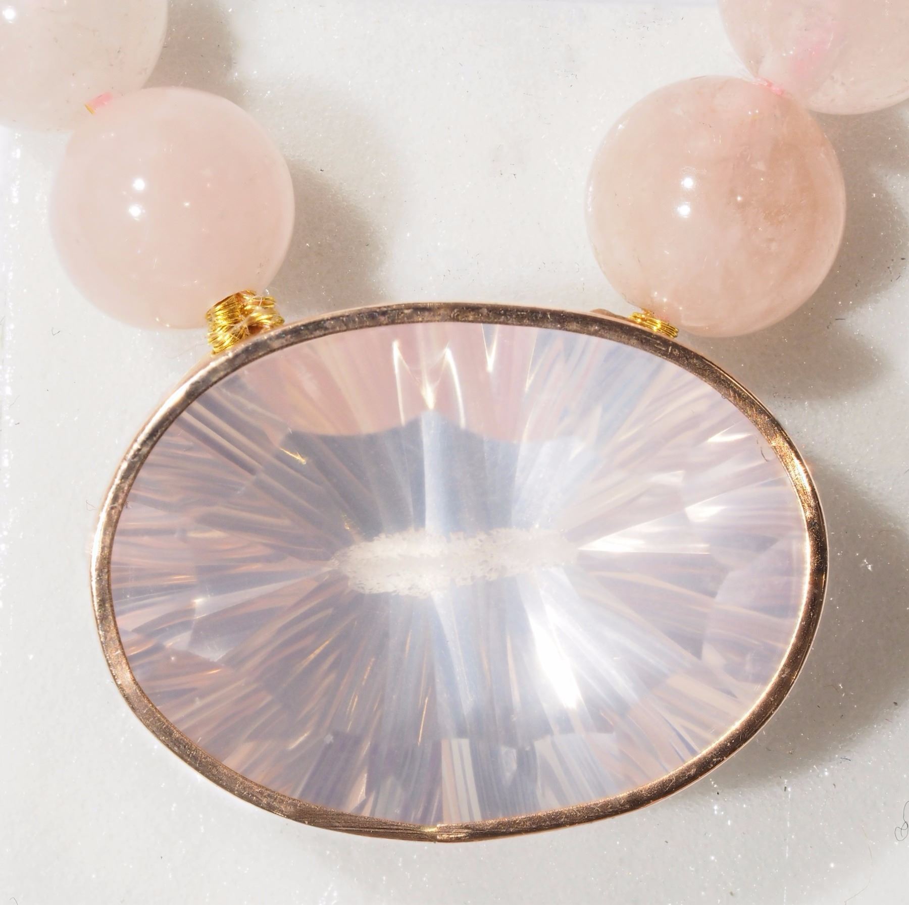 MORGANITE PENDANT. 36-NT58- 18K YELLOW GOLD CLASP ROSE QUARTZ NECKLACE WITH MORGANITE PENDANT W/COA. SUGGESTED REPLACEMENT VALUE $1950.00. JEWELLERY