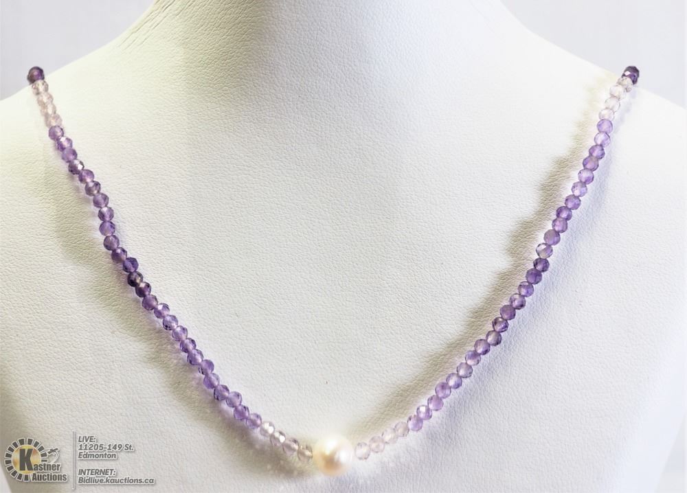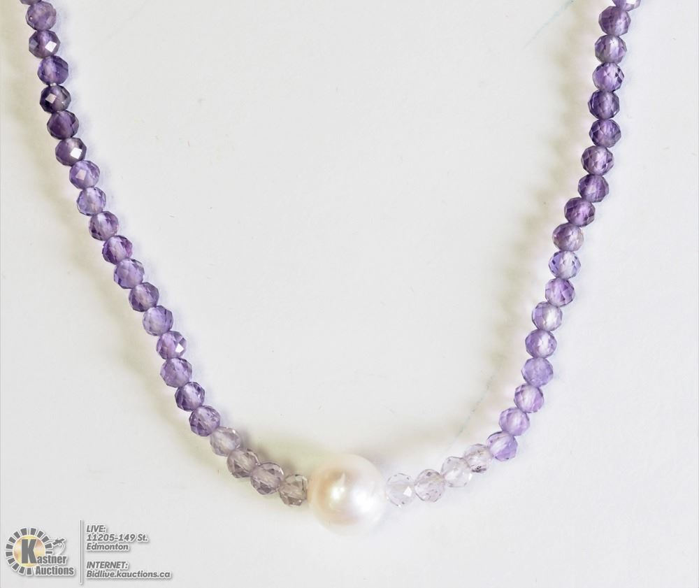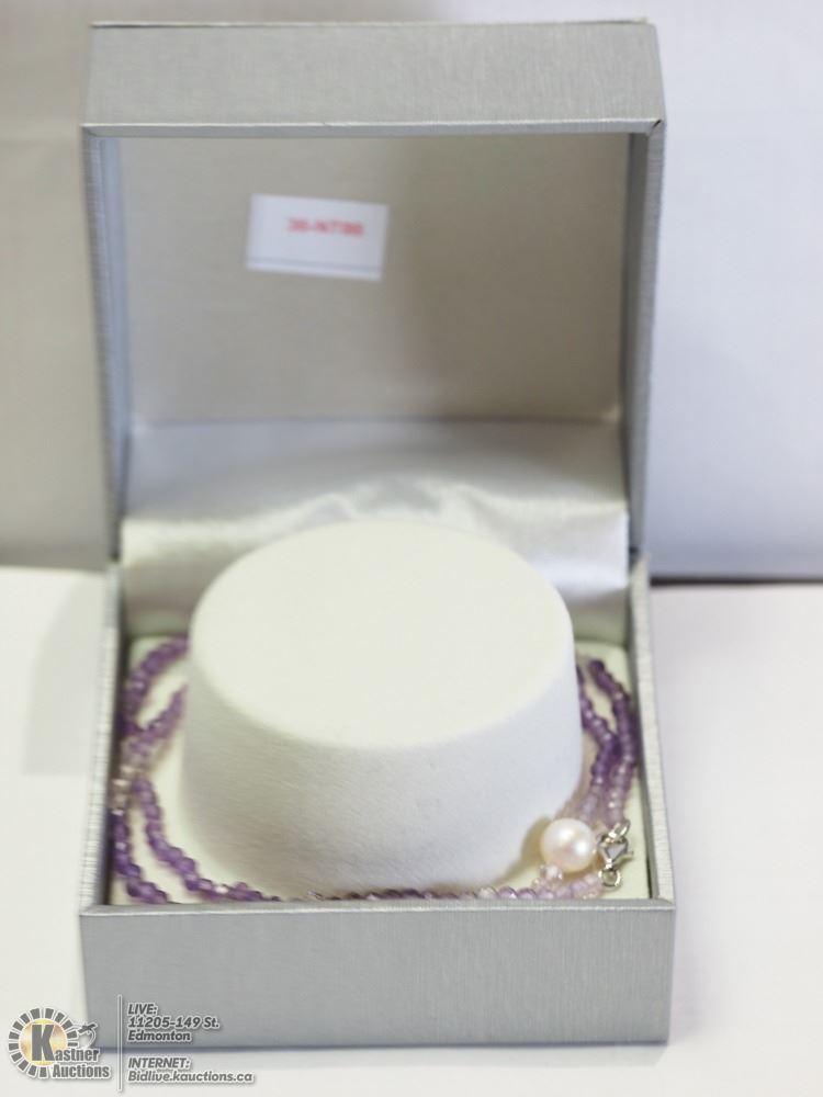 36-NT86- STERLING SILVER GRADUATED COLOUR GENUINE AMETHYST WITH FRESHWATER PEARL DROP (APP. 25CT). JEWELRY