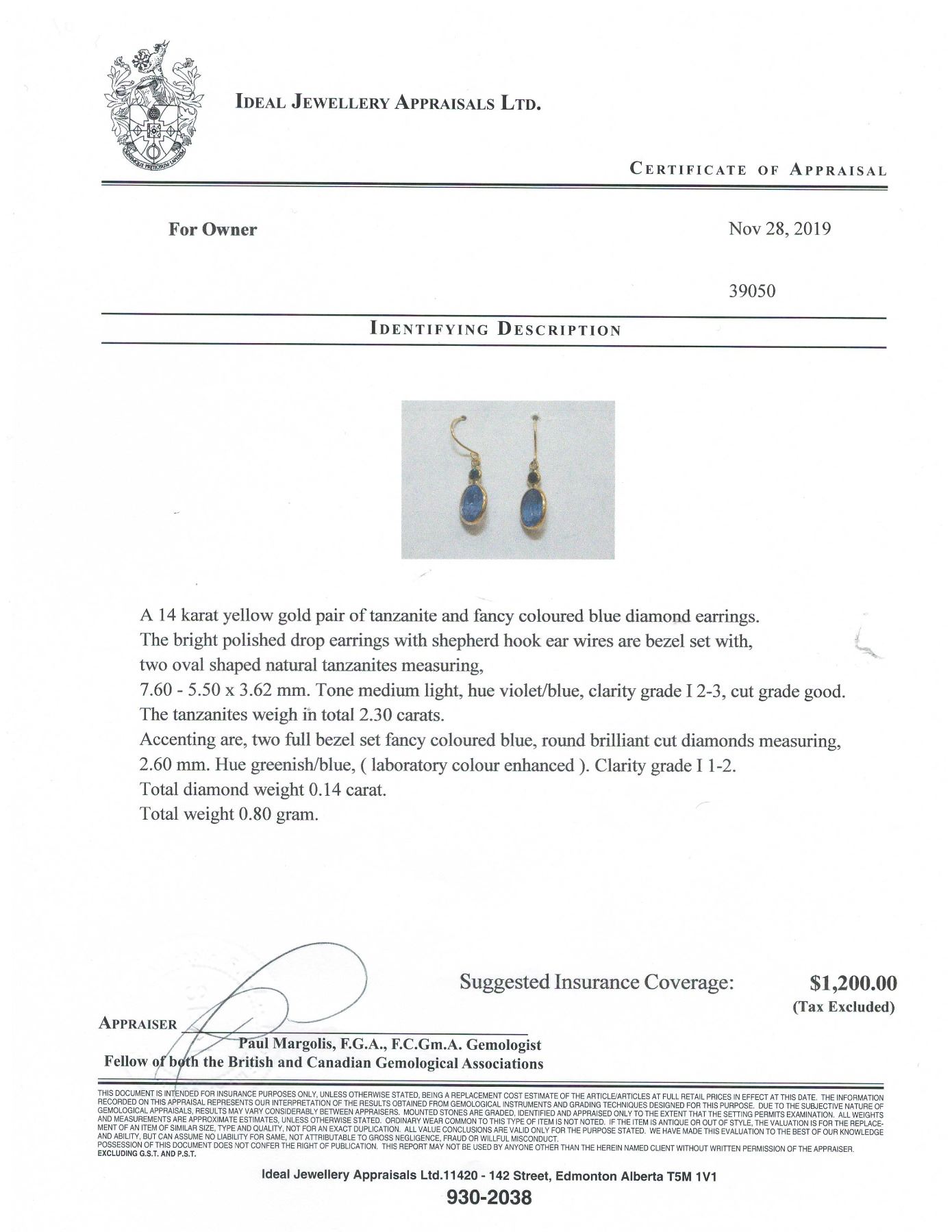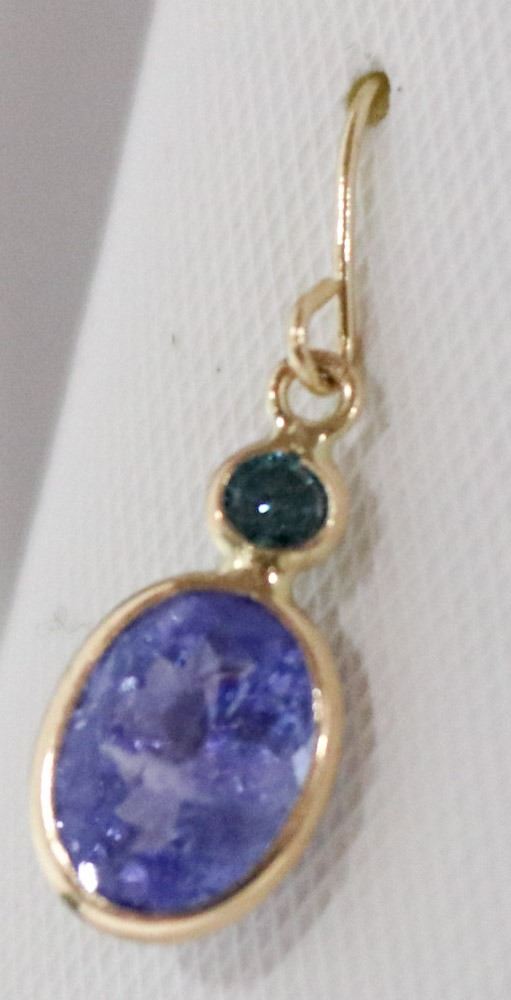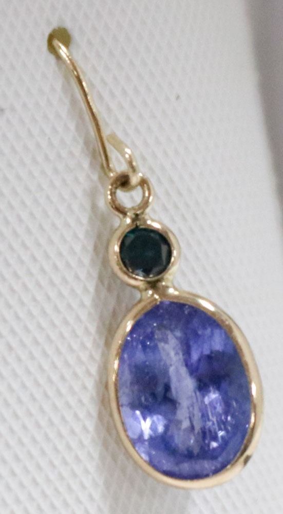 WITH LOCAL APPRAISAL, TWO OVAL SHAPED NATURAL TANZANITES CLARITY GRADE I 2-3, CUT GRADE GOOD, CARAT WEIGHT 2.30 CARATS, TWO BEZEL BLUE ROUND BRILLIANT CUT DIAMONDS (LABRATORY COLOR ENHANCED), CLARITY GRADE I 1-2, TOTAL DIAMOND WEIGHT 0.14CARATS, TOTAL WEIGHT 0.80 GRAMS. SUGGESTED INSURANCE COVERAGE $1,200.00. JEWELLERY