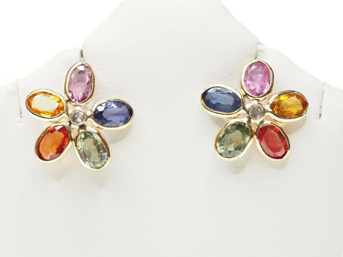 #37-14KT GOLD MULTI COLORED SAPPHIRE (5.5CT) AND DIAMOND (0.1CT) EARRINGS