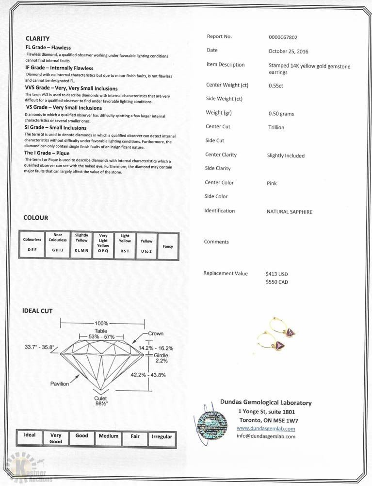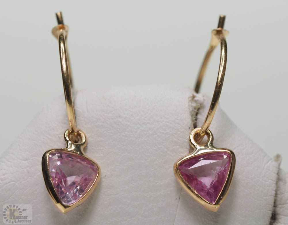14KT YELLOW GOLD PINK SAPPHIRE (0.55CT) EARRINGS W/ COA - SUGGESTED REPLACEMENT VALUE $550.00