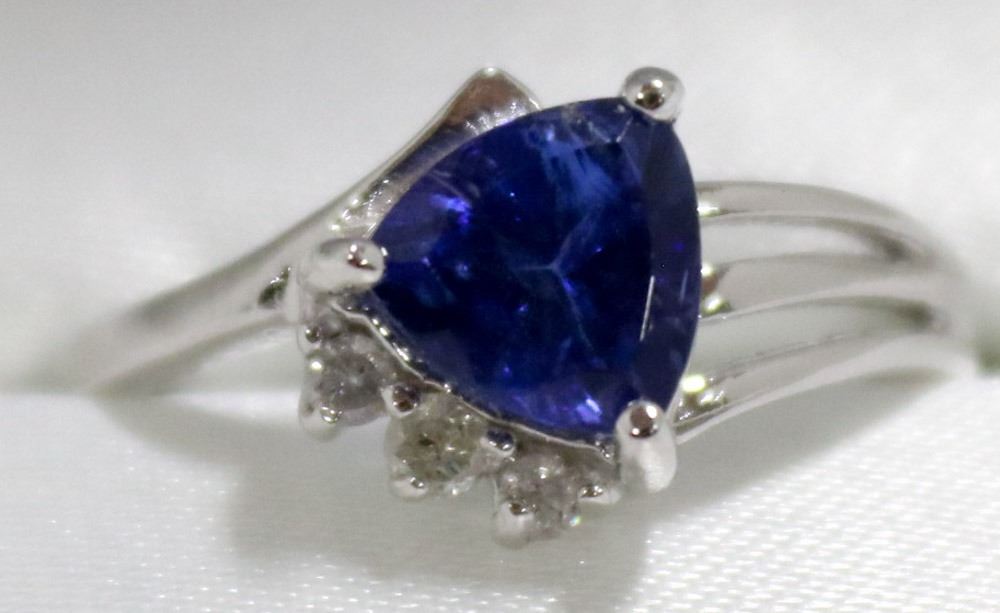 SIZE 6.75 WITH LOCAL APPRAISAL, ONE TRILLIANT CUT TANZANITE, CLARITY GRADE I-1, CUT GRADE VERY GOOD, TANZANITE WEIGHS 1.10 CARATS, THREE ROUND BRILLIANT CUT DIAMONDS, CLARITY GRADE I-2, COLOR GRADE H-I, DIAMONDS WEIGH 0.05 CARATS, TOTALWEIGHT 2.00 GRAMS. SUGGESTED INSURANCE COVERAGE $1,300.00. JEWELLERY