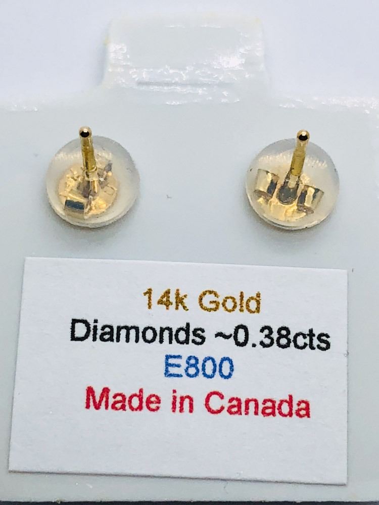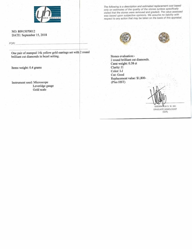 88 - JP263 - 14K YELLOW GOLD DIAMOND (I-J, I1, 0.38CTS) EARRINGS, MADE IN CANADA W/COA, APPRAISAL NOT FROM A LOCAL VERIFIED APPRAISER. SUGGESTED REPLACEMENT VALUE $1800.00. JEWELLERY