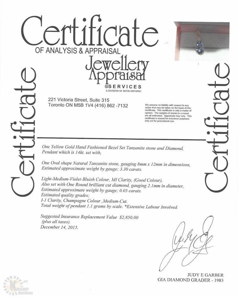 14KT YELLOW GOLD TANZANITE(3.30CT)& DIAMOND PENDANT HAND CRAFTED IN CANADA W/ COA - SUGGESTED REPLACEMENT VALUE $2,850.00