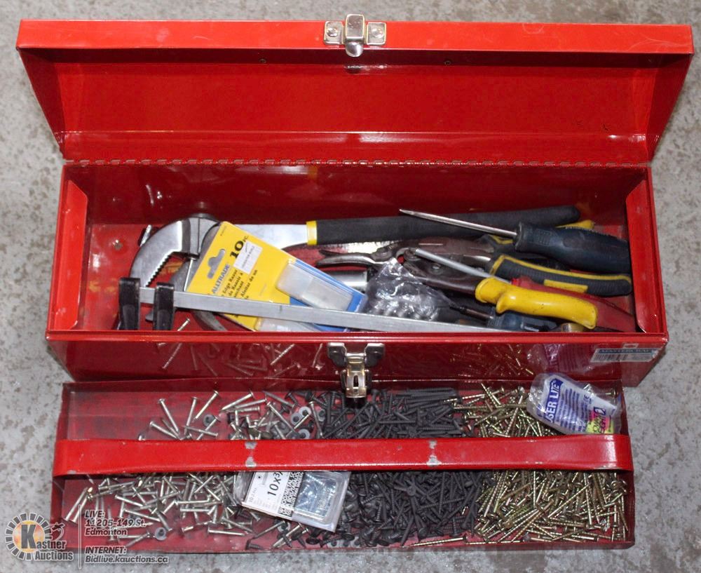 38) RED METAL TOOL BOX WITH CONTENTS -ON CHOICE-