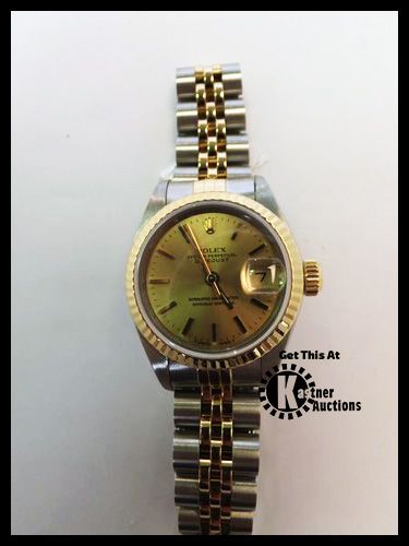STAINLESS ROLEX OYSTER PERPETUAL DATEJUST WATCH, BRACELET 21 LINKS, CHAMPAGNE DIAL, YELLOW 13MM ROLESTER FLUTED BEZEL, RETAIL VALUE $8,850.00