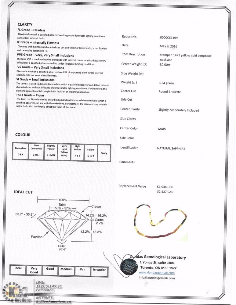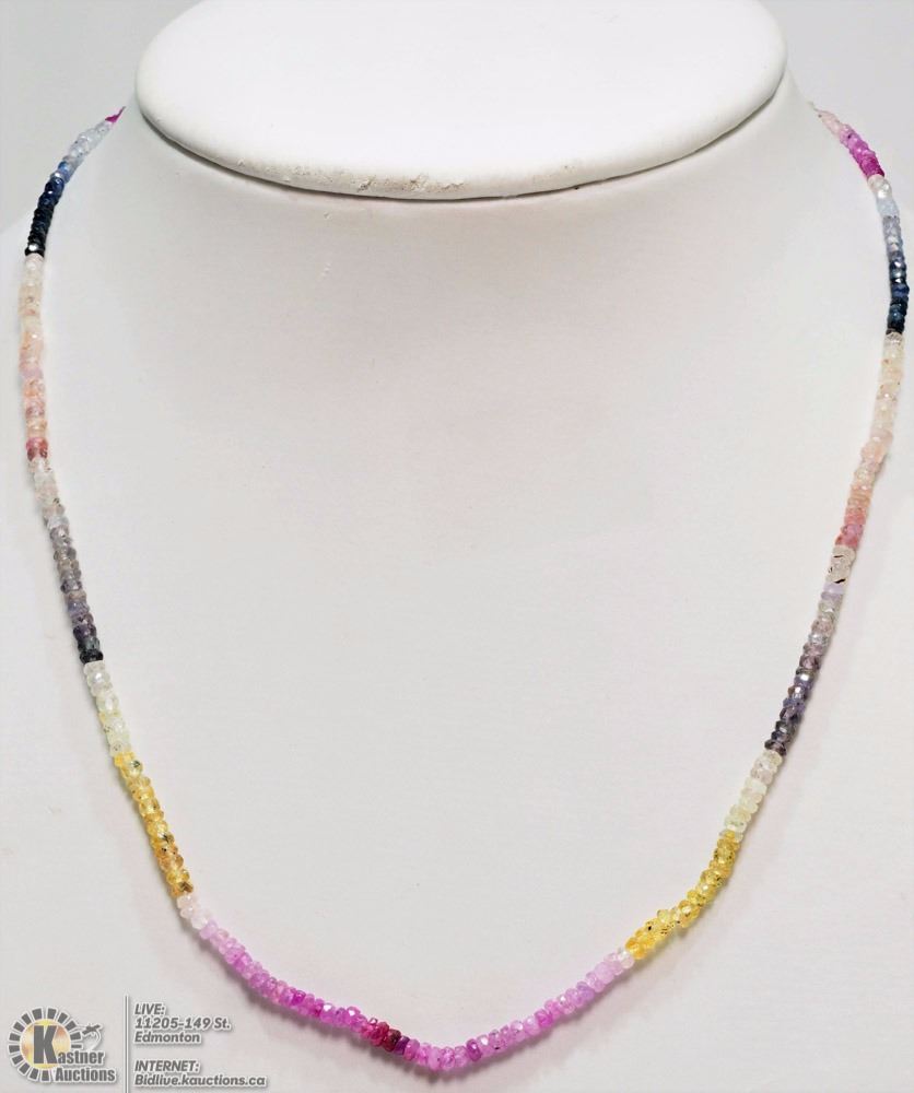 39 - GS15: 14KT YELLOW GOLD MULTI-COLORED SAPPHIRE (30.0CT) BEAD NECKLACE W/ COA - SUGGESTED REPLACEMENT VALUE $2,527.00