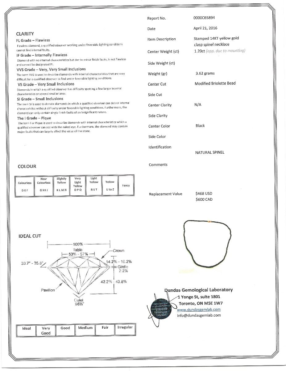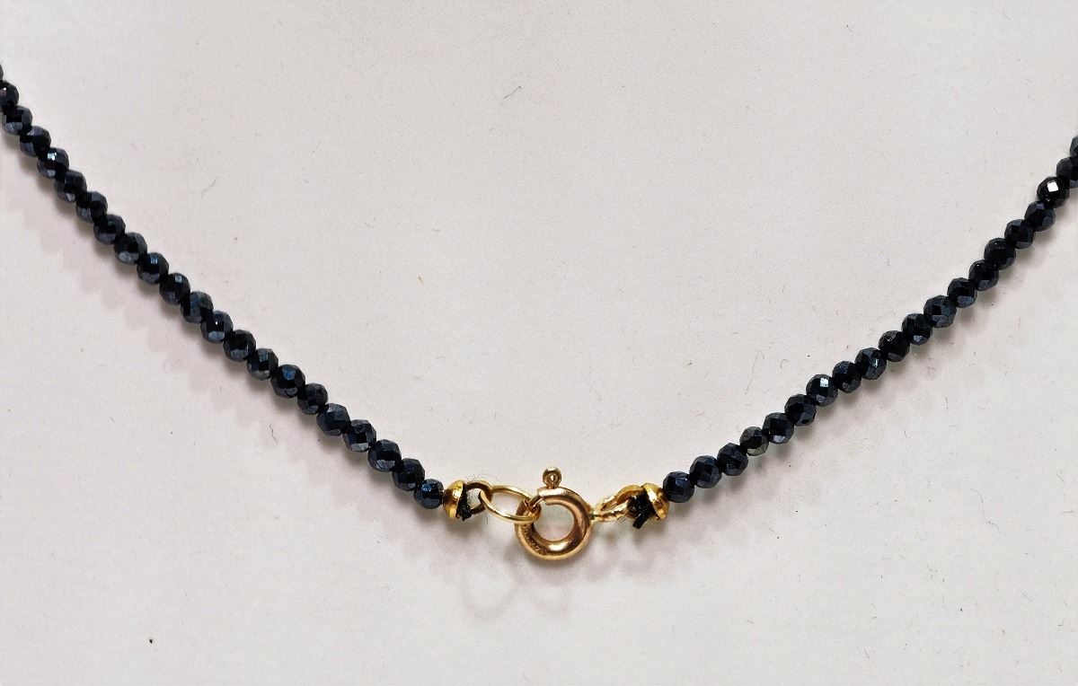 14KT YELLOW GOLD CLASP BLACK SPINEL NECKLACE. WITH COA- SUGGESTED REPLACEMENT VALUE $600.00