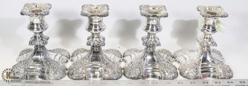 4 ENGRAVED LARGE CANDLE HOLDERS CIRCA 1900. BASE IS 5" SQUARE . HEIGHT 5". STAMPED ON BOTTOM CORONET PLATE.